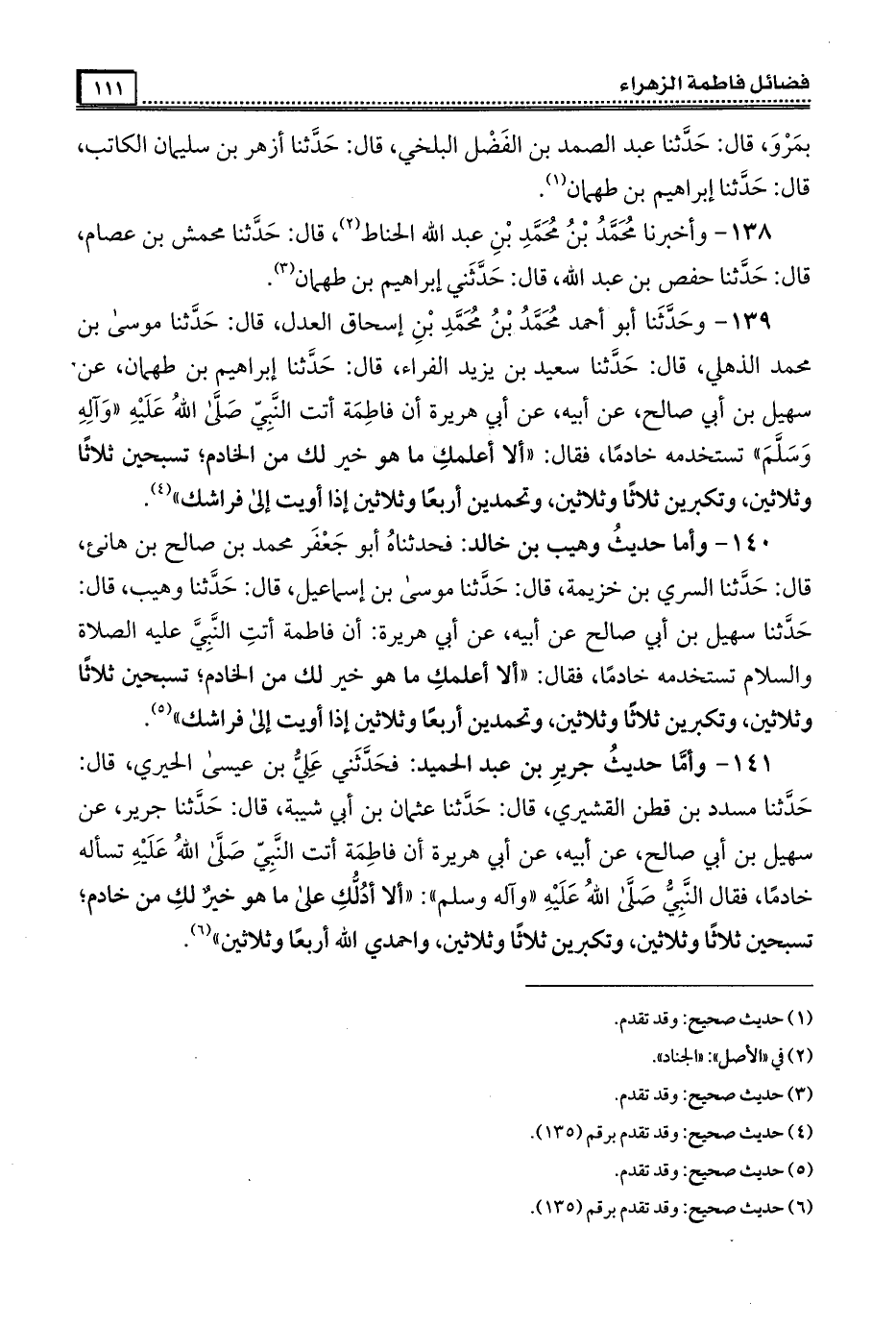 141- فحدثني علي بن عيسى الحيري ، قال : حَدَّثَنَا مسدد بن قطن القشيري ، قال : حَدَّثَنَا عثمان بن أبي شيبة ، قال : حَدَّثَنَا جرير عن سهيل بن أبي صالح عن أبيه عن أبي هريرة أن فَاطِمَة أتت النبي صَلَّى الله عَلَيْهِ تسأله خادما فقال النبي صَلَّى الله عَلَيْهِ وَآلِهِ وَسَلَّمَ ألا أدلك على ما هو خير لك من خادم تسبحين ثلاثًا وثلاثين وتكبرين ثلاثًا وثلاثين واحمدي الله أربعًا وثلاثين .