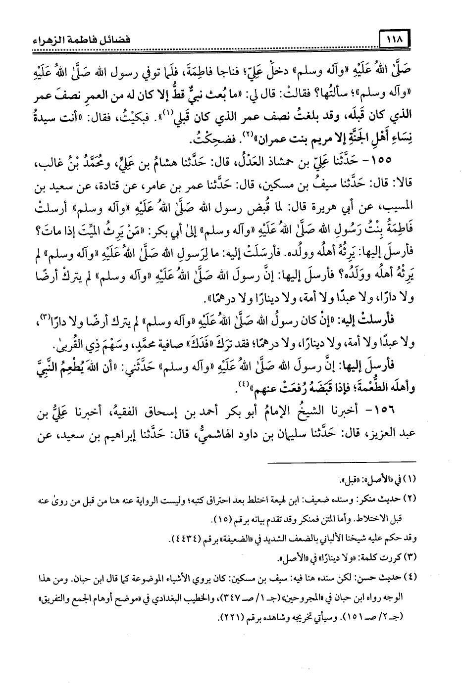 155- حَدَّثَنَا علي بن حمشاذ العدل ، قال : حَدَّثَنَا هشام بن علي ، ومُحَمَّد بن غالب قالا ، قال : حَدَّثَنَا سيف بن مسكين ، قال : حَدَّثَنَا عمر بن عامر عن قتادة عن سعيد بن المسيب عن أبي هريرة قال لما قبض رسول الله صَلَّى الله عَلَيْهِ وَآلِهِ وَسَلَّمَ ، أرسلت فَاطِمَة بنت رسول الله صَلَّى الله عَلَيْهِ وَآلِهِ وَسَلَّمَ إلى أبي بكر من يرث الميت إذا مات ؟ فأرسل إليها يرثه أهله وولده فأرسلت إليه ما لرسول الله صَلَّى الله عَلَيْهِ وَآلِهِ وَسَلَّمَ لم يرثه أهله وولده ، فأرسل إليها إن رسول الله صَلَّى الله عَلَيْهِ وَآلِهِ وَسَلَّمَ لم يترك أرضا ولا دارا ولا عبدا ولا أمة ولا دينارا ولا درهما .