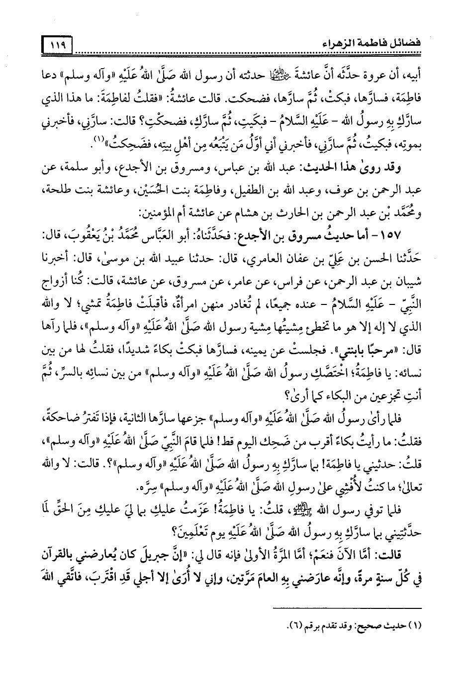 157- فحَدَّثَنَاه أبو العباس مُحَمَّد بن يعقوب ، قال : حَدَّثَنَا الحسن بن علي بن عفان العامري ، قال : حَدَّثَنَا عبيد الله بن موسى قال أَخْبَرَنَا شيبان بن عبد الرحمن ، عن فراس ، عن عامر ، عن مسروق ، عن عَائِشَة ، قالت : كنا أزواج النبي عليه السَّلام عنده جميعا لم تغادر منهن امرأة فأقبلت فَاطِمَة تمشي لا والله الذي لا إله إلا هو ما تخطيء مشيتها مشية رسول الله صَلَّى الله عَلَيْهِ وَآلِهِ وَسَلَّمَ فلما رآها قال : مرحبا بابنتي ، فجلست عن يمينه فسارها فبكت بكاء شديدا فقلت لها من بين نسائه : يا فَاطِمَة اختصك رسول الله صَلَّى الله عَلَيْهِ وَآلِهِ وَسَلَّمَ من بين نسائه بالسر ثم أنت تجزعين من البكاء كما أرى .
