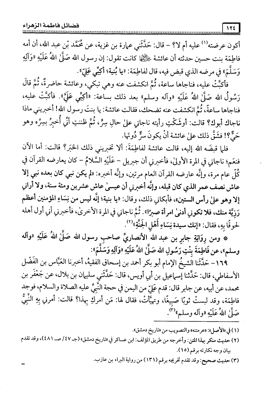 169- حَدَّثَنَا الشيخ الإمام أبو بكر أحمد بن إسحاق الفقيه أَخْبَرَنَا العباس بن الفضل الأسفاطي ، قال : حَدَّثَنَا إسماعيل بن أبي أويس قال حدثني سليمان بن بلال ، عن جعفر بن مُحَمَّد عن أبيه عن جابر قال قدم علي من اليمن في حجة النبي عليه الصلاة والسَّلام فوجد فَاطِمَة وقد لبست ثوبا صبيغا وتهيأت فقال لها من أمرك بهذا قالت أمرني به النبي صَلَّى الله عَلَيْهِ وَآلِهِ وَسَلَّمَ .