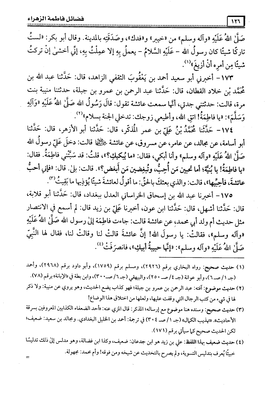 174- حَدَّثَنَا مُحَمَّد بن علي بن عمر المذكر ، قال : حَدَّثَنَا أبو الأزهر ، قال : حَدَّثَنَا أبو أسامة عن مجالد عن عامر عن مسروق عن عَائِشَة رَضِىَ الله عَنْها قالت دخل علي رسول الله صَلَّى الله عَلَيْهِ وَآلِهِ وَسَلَّمَ وأنا أبكي فقال ما يبكيك قلت قد سبتني فَاطِمَة فقال يا فَاطِمَة يا بنية أما تحبين من أحب وتبغضين من أبغض قالت بلى قال فإني أحب عَائِشَة فأحبيها قالت والذي بعثك بالحق ما أقول لعَائِشَة شيئا يؤذيها ما بقيت .