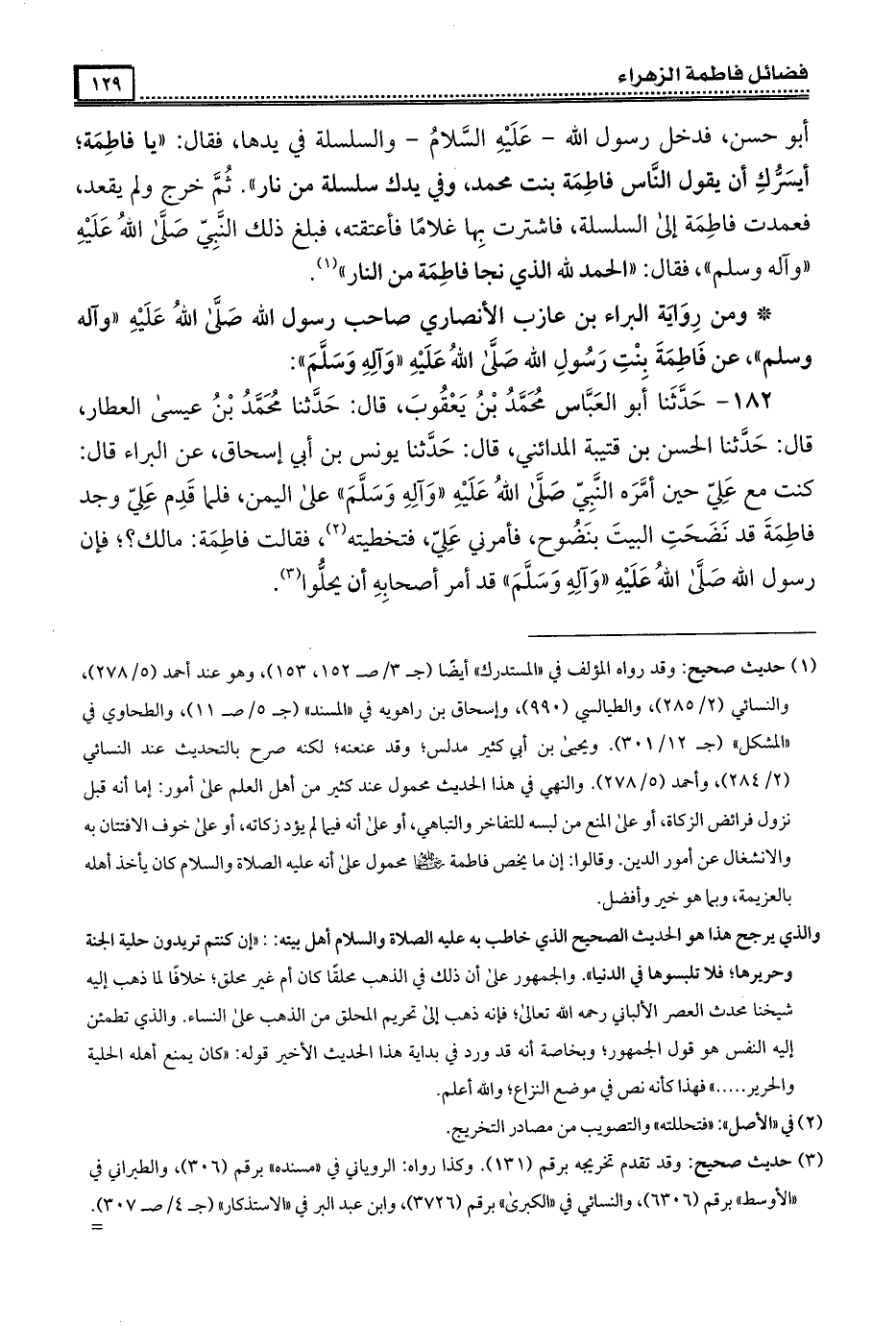 182- حَدَّثَنَا أبو العباس مُحَمَّد بن يعقوب ، قال : حَدَّثَنَا مُحَمَّد بن عيسى العطار ، قال : حَدَّثَنَا الحسن بن قتيبة المدائني ، قال : حَدَّثَنَا يونس بن أبي إسحاق عن البراء قال كنت مع علي حين أمره النبي صَلَّى الله عَلَيْهِ وَآلِهِ وَسَلَّمَ على اليمن فلما قدم علي وجد فَاطِمَة قد نضحت البيت بنضوح فأمرني علي فتخطيته فقالت فَاطِمَة مالك ؟ فإن رسول الله صَلَّى الله عَلَيْهِ وَآلِهِ وَسَلَّمَ قد أمر أصحابه أن يحلوا .