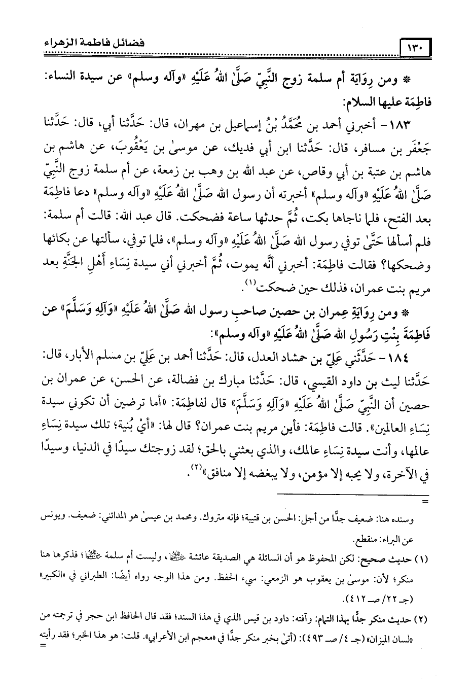 184- حدثني علي بن حمشاد (1) العدل ، قال : حَدَّثَنَا أحمد بن علي بن مسلم الأبار ، قال : حَدَّثَنَا ليث بن داود القيسي ، قال : حَدَّثَنَا مبارك بن فضالة عن الحسن عن عمران بن حصين أن النبي صَلَّى الله عَلَيْهِ وَآلِهِ وَسَلَّمَ قال لفَاطِمَة أما ترضين أن تكوني سيدة نساء العالمين قالت فَاطِمَة فأين مريم بنت عمران ؟ قال لها أي بنية تلك سيدة نساء عالمها وأنت سيدة نساء عالمك والذي بعثني بالحق لقد زوجتك سيدًا في الدنيا ، وسيدًا في الآخرة ولا يحبه إلا مؤمن ولا يبغضه إلا منافق .