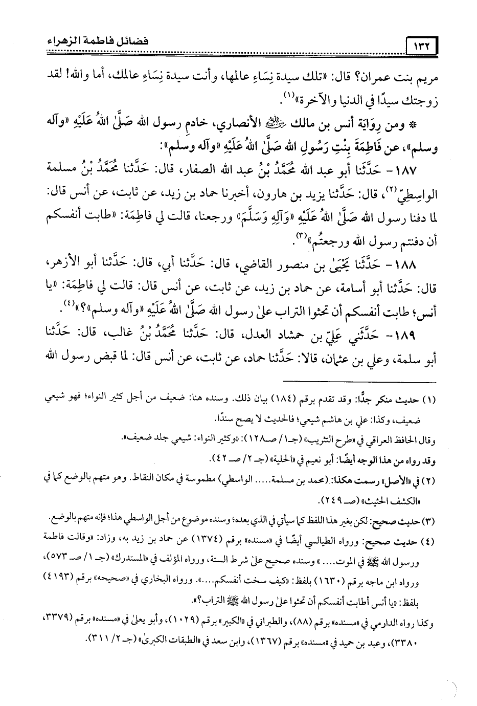 187- حَدَّثَنَا أبو عبد الله مُحَمَّد بن عبد الله الصفار ، قال : حَدَّثَنَا مُحَمَّد بن مسلمة الواسطي ، قال : حَدَّثَنَا يزيد بن هارون أَخْبَرَنَا حماد بن زيد عن ثابت عن أنس قال لما دفنا رسول الله صَلَّى الله عَلَيْهِ وَآلِهِ وَسَلَّمَ ورجعنا قالت لي فَاطِمَة طابت أنفسكم أن دفنتم رسول الله ورجعتم .