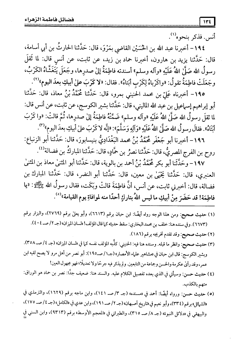 197- وحَدَّثَنَا أبو بكر مُحَمَّد بن أحمد بن بالويه ، قال : حَدَّثَنَا أبو المثنى معاذ بن المثنى العنبري ، قال : حَدَّثَنَا يحيى بن معين ، قال : حَدَّثَنَا أبو النضر ، قال : حَدَّثَنَا المبارك بن فضالة قال أَخْبَرَنِي ثابت عن أنس أن فَاطِمَة قالت وبكت فقال رسول الله صَلَّى الله عَلَيْهِ وَآلِهِ وَسَلَّمَ يا فَاطِمَة قد حضر من أبيك ما ليس الله بتارك أحدا منه لموافاة يوم القيامة .