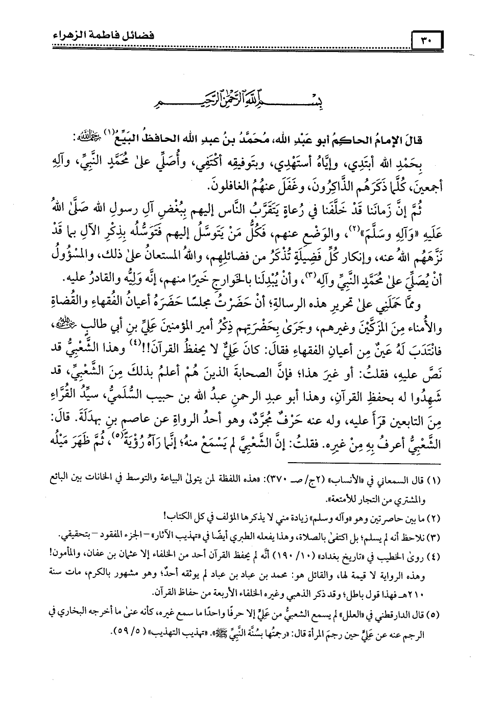 ثم إن زماننا قد خلفنا في رعاة يتقرب الناس إليهم ببغض آل رسول الله صَلَّى الله عَلَيْهِ وَآلِهِ وَسَلَّمَ ، والوضع عنهم ، فكل من يتوسل إليهم فتوسله بذكر الآل بما قد نزههم الله عنه ، وإنكار كل فضيلة تذكر من فضائلهم ، والله المستعان على ذلك ، والمسؤول أن يصلي على مُحَمَّد النبي وآله ، وأن يبدلنا بالخوارج خيرا منهم ، إنه وليه والقادر عليه . ومما حملني على تحرير هذه الرسالة ، أن حضرت مجلسا حضره أعيان الفقهاء والقضاة والأمناء من المزكين وغيرهم ، وجرى بحضرتهم ذكر أمير المؤمنين علي بن أبي طالب رَضِىَ الله عَنْه ، فانتدب له عين من أعيان الفقهاء فقال : كان علي لا يحفظ القرآن !! وهذا الشعبي قد نص عليه ، فقلت : أو غير هذا ، فإن الصحابة الذين هم أعلم بذلك من الشعبي ، قد شهدوا له بحفظ القرآن ، وهذا أبو عبد الرحمن عبد الله بن حبيب السلمي ، سيد القراء من التابعين قرأ عليه ، وله عنه حرف مجرد ، وهو أحد الرواة عن عاصم بن بهدلة . قال : الشعبي أعرف به من غيره . فقلت : إن الشعبي لم يسمع منه ، إنما رآه رؤية، ثم ظهر ميله