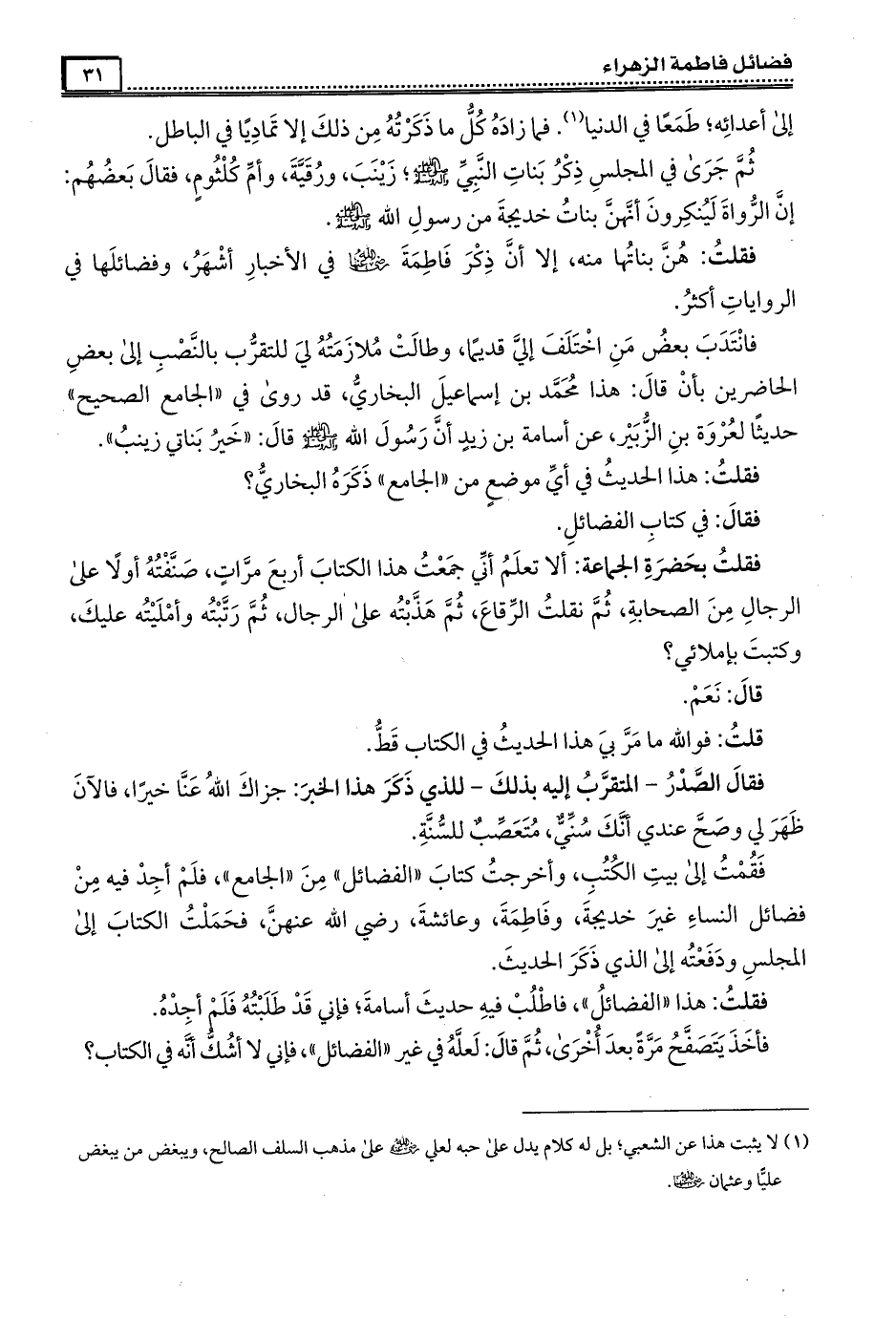 فقمت إلى بيت الكتب ، وأخرجت كتاب الفضائل من الجامع ، فلم أجد فيه من فضائل النساء غير خديجة ، وفَاطِمَة ، وعَائِشَة ، رَضِىَ الله عَنْهن ، فحملت الكتاب إلى المجلس ودفعته إلى الذي ذكر الحديث .