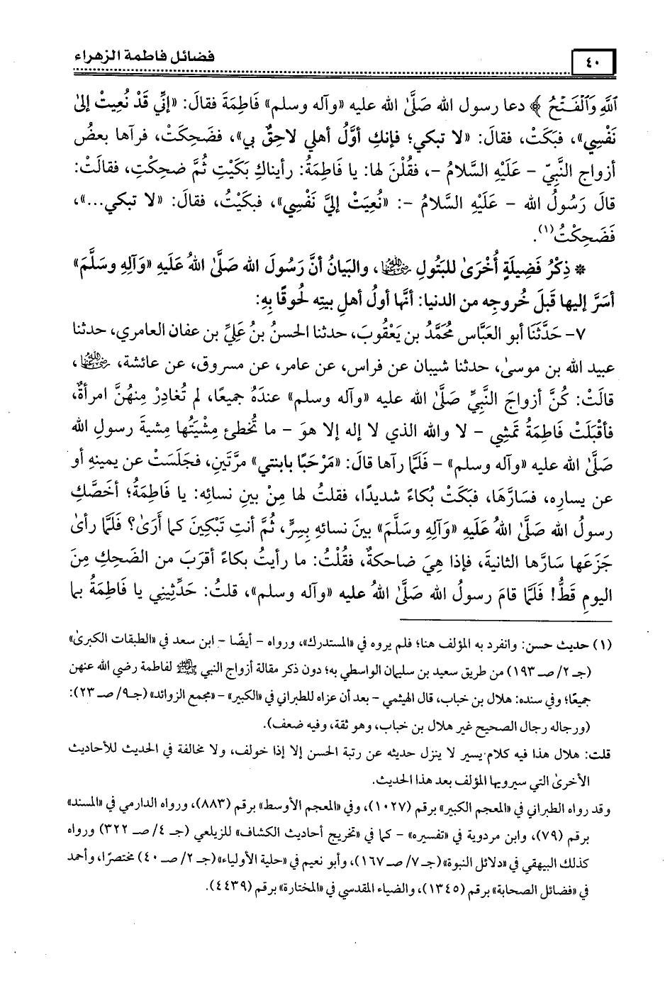 7- حَدَّثَنَا أبو العباس مُحَمَّد بن يعقوب ، حَدَّثَنَا الحسن بن علي بن عفان العامري ، حَدَّثَنَا عبيد الله بن موسى ، حَدَّثَنَا شيبان عن فراس ، عن عامر ، عن مسروق ، عن عَائِشَة ، رَضِىَ الله عَنْها قالت : كن أزواج النبي صَلَّى الله عَلَيْهِ وَآلِهِ وَسَلَّمَ عنده جميعا ، لم تغادر منهن امرأة ، فأقبلت فَاطِمَة تمشي ، لا والله الذي لا إله إلا هو ما تخطئ مشيتها مشية رسول الله صَلَّى الله عَلَيْهِ وَآلِهِ وَسَلَّمَ ، فلما رآها قال : مرحبا بابنتي مرتين فجلست عن يمينه ، أو عن يساره ، فسارها فبكت بكاء شديدا ، فقلت لها من بين نسائه : يا فَاطِمَة ، أخصك رسول الله صَلَّى الله عَلَيْهِ وَآلِهِ وَسَلَّمَ بين نسائه بسر ، ثم أنت تبكين كما أرى ؟ فلما رأى جزعها سارها الثانية ، فإذا هي ضاحكة ، فقلت : ما رأيت بكاء أقرب من الضحك من اليوم قط ! فلما قام رسول الله صَلَّى الله عَلَيْهِ وَآلِهِ وَسَلَّمَ ، قلت حديثني يا فَاطِمَة بما سارك النبي صَلَّى الله عَلَيْهِ وَآلِهِ وَسَلَّمَ ؟ قالت : لا والله ماكنت لأفشي على رسول الله صَلَّى الله عَلَيْهِ وَآلِهِ وَسَلَّمَ سره ، فلما توفي رسول الله صَلَّى الله عَلَيْهِ وَآلِهِ وَسَلَّمَ قلت : يا فَاطِمَة ، عزمت عليك ، بما لي عليك من الحق ، إلا حدثتيني بما سارك رسول الله صَلَّى الله عَلَيْهِ وَآلِهِ وَسَلَّمَ لو تعلمين ؟ قالت : فأما الآن ، فنعم ، أما المرة الأولى فإنه قال لي ، إن جبرئيل كان يعارضني القرآن في كل سنة مرة ، وإنه عارضني هذا العام مرتين ، وإني لا أرى إلا أجلي قد اقترب ، فاتقي الله واصبري ، فنعم السلف أنا لك فجزعت ، فكان البكاء لذلك ، فسارني الثانية فقال : أما ترضين أنك تأتين سيدة نساء المسلمين ، أو سيدة نساء هذه الأمة .