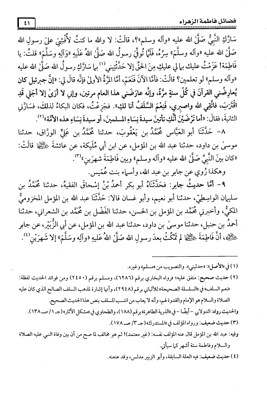 فحَدَّثَنَاه أبو بكر أحمد بن إسحاق الفقيه ، حَدَّثَنَا مُحَمَّد بن سليمان الواسطي ، حَدَّثَنَا أبو نعيم ، وأبو غسان قالا : حَدَّثَنَا عبد الله بن المؤمل المخزومي المكي وأَخْبَرَنِي مُحَمَّد بن المؤمل بن الحسن، حَدَّثَنَا الفضل بن مُحَمَّد الشعراني ، حَدَّثَنَا أحمد بن حنبل ، حَدَّثَنَا موسى بن داود ، حَدَّثَنَا عبد الله بن المؤمل عن أبي الزبير ، عن جابر ، رَضِىَ الله عَنْه : أن فَاطِمَة رَضِىَ الله عَنْها لم تمكث بعد رسول الله صَلَّى الله عَلَيْهِ وَآلِهِ وَسَلَّمَ إلا شهرين.