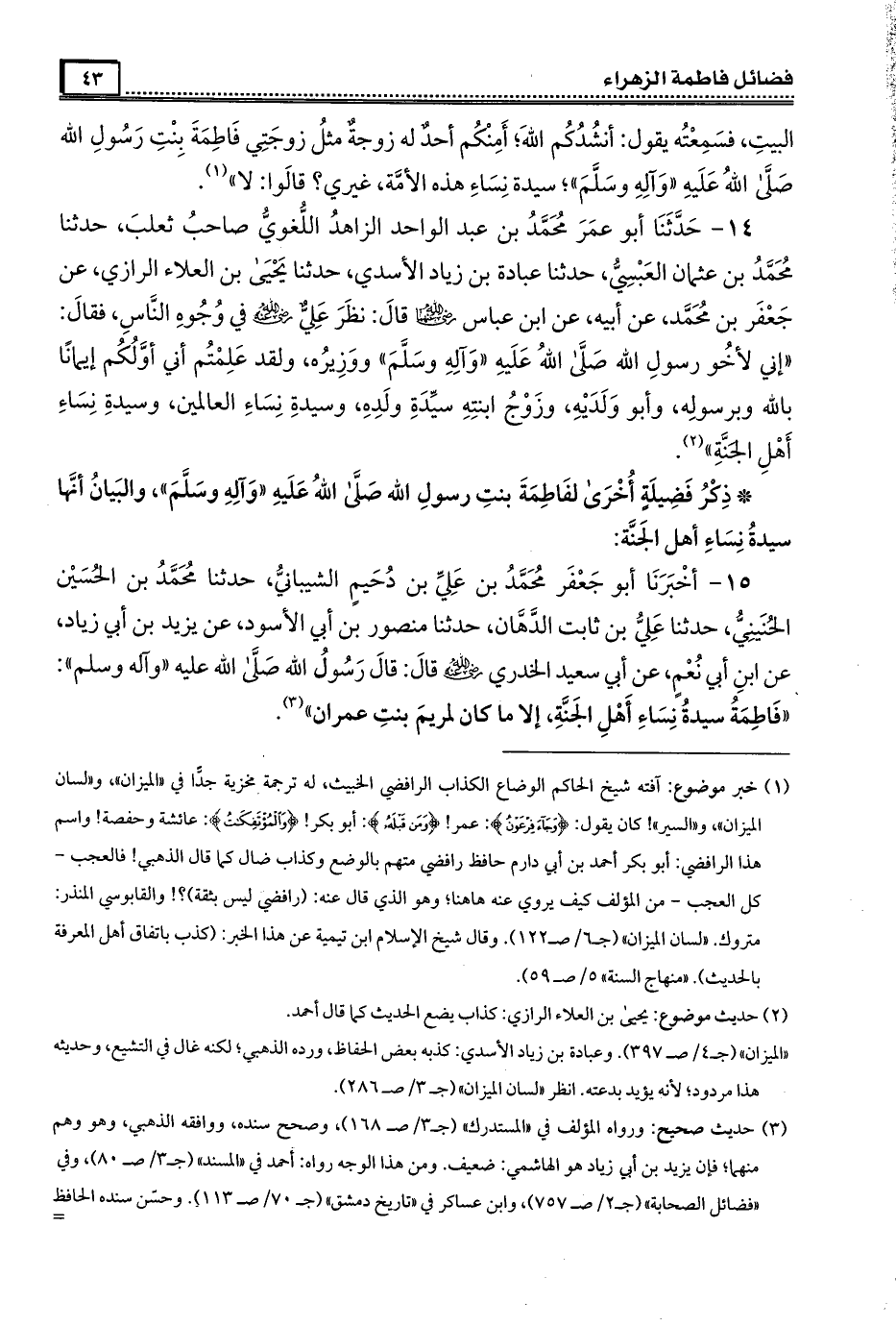 14- حَدَّثَنَا أبو عمر مُحَمَّد بن عبد الواحد الزاهد اللغوي صاحب ثعلب ، حَدَّثَنَا مُحَمَّد بن عثمان العبسي ، حَدَّثَنَا عبادة بن زياد الأسدي ، حَدَّثَنَا يحيى بن العلاء الرازي ، عن جعفر بن مُحَمَّد ، عن أبيه ، عن ابن عباس رَضِىَ الله عَنْهما قال : نظر علي رَضِىَ الله عَنْه في وجوه الناس ، فقال : إني لأخو رسول الله صلى عليه وآله وسلم ووزيره ، ولقد علمتم أني أولكم إيمانا بالله وبرسوله ، وأبو ولديه ، وزوج ابنته سيدة ولده ، وسيدة نساء العالمين ، وسيدة نساء أهل الجنة .