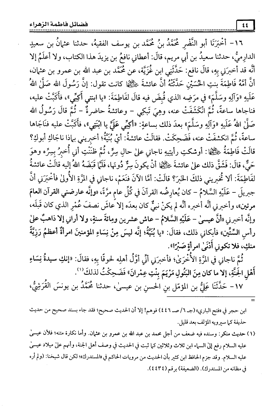 16- أَخْبَرَنَا أبو النضر مُحَمَّد بن مُحَمَّد بن يوسف الفقيه ، حَدَّثَنَا عثمان بن سعيد الدارمي ، حَدَّثَنَا سعيد بن أبي مريم ، قال أعطاني نافع بن يزيد هذا الكتاب ، ولا أعلم إلا أنه قد أَخْبَرَنِي به ، قال نافع : حدثني ابن غزية ، عن مُحَمَّد بن عبد الله بن عمرو بن عثمان أن أمه فَاطِمَة بنت الحسين حدثته أن عَائِشَة رَضِىَ الله عَنْها كانت تقول : أن رسول الله صَلَّى الله عَلَيْهِ وَآلِهِ وَسَلَّمَ في مرضه الذى قبض فيه قال لفَاطِمَة : يا ابنتى أكبى ، فأكبت عليه ، فناجاها ساعة ثم انكشفت عنه وهي تبكي ، وعَائِشَة حاضرة ، ثم قال رسول الله صَلَّى الله عَلَيْهِ وَآلِهِ وَسَلَّمَ بعد ذلك بساعة ، أكبي علي يا ابنتي ، فأكبت عليه ، فناجاها ساعة ، ثم انكشفت عنه ، فضحكت . فقالت عَائِشَة : أي بنية ، أخبريني بماذا ناجاك أبوك ؟ قالت فَاطِمَة رَضِىَ الله عَنْها : أوشكت رأيتيه ناجاني على حال سر ثم ظننت أني أخبر بسره ، وهو حي ، قال : فشق ذلك على عَائِشَة رَضِىَ الله عَنْها أن يكون سر دونها ، فلما قبضه الله إليه قالت عَائِشَة لفَاطِمَة : ألا تخبريني ذلك الخبر ؟ قالت : أما الآن فنعم ، ناجاني في المرة الأولى فأَخْبَرَنِي أن جبريل عليه السَّلام ، كان يعارضه القرآن في كل عام مرة وإنه عارضني القرآن العام مرتين وأَخْبَرَنِي أنه أخبره أنه لم يكن نبي كان بعده إلا عاش نصف عمر الذى كان قبله ، وإنه أخبرنى أن عيسى عليه السَّلام عاش عشرين ومائة سنة ولا أرانى إلا ذاهب على رأس الستين فأبكانى ذلك ، فقال يا بنية إنه ليس من نساء المؤمنين امرأة أعظم رزية منك فلا تكونى أدنى امرأة صبرا .