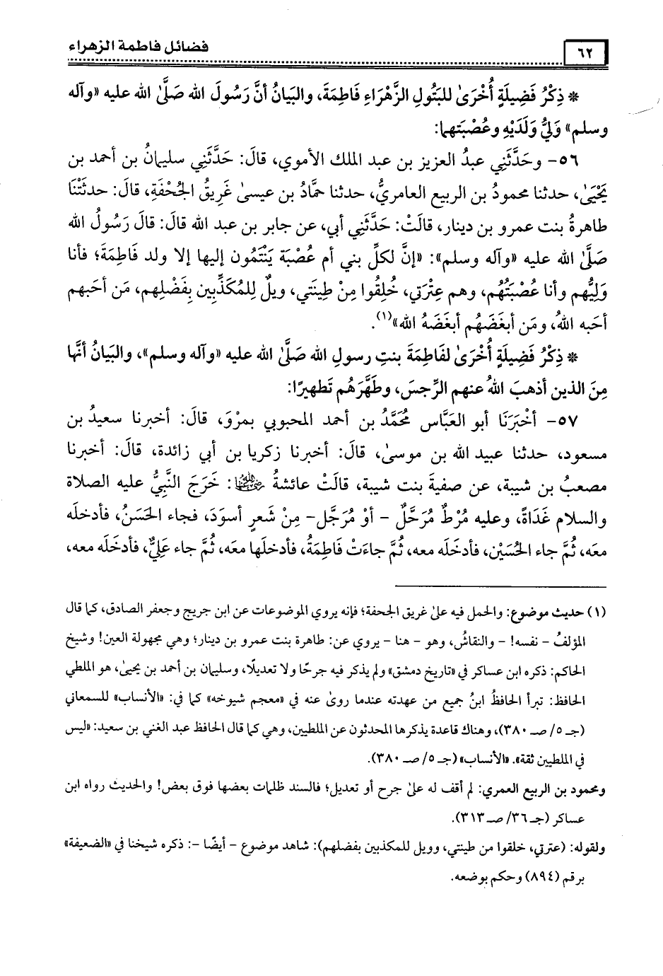 56- وحدثني عبد العزيز بن عبد الملك الأموي ، قال : حدثني سليمان بن أحمد بن يحيى ، حَدَّثَنَا محمود بن الربيع العامري ، حَدَّثَنَا حماد بن عيسى غريق الجحفة ، قال حدثتنا طاهرة بنت عمرو بن دينار ، قالت : حدثني أبي عن جابر بن عبد الله ، قال : قال رسول الله صَلَّى الله عَلَيْهِ وَآلِهِ وَسَلَّمَ : إن لكل بني أم عصبة ينتمون إليها إلا ولد فَاطِمَة فأنا وليهم وأنا عصبتهم وهم عترتي ، خلقوا من طينتي ، ويل للمكذبين بفضلهم ، من أحبهم أحبه الله ، ومن أبغضهم أبغضه الله.