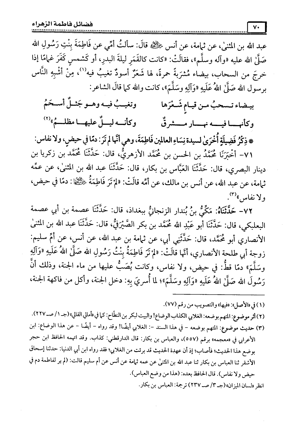 71- أَخْبَرَنَا مُحَمَّد بن الحسن بن مُحَمَّد الأزهري ، قال : حَدَّثَنَا مُحَمَّد بن زكريا بن دينار البصري , قال: حَدَّثَنَا العباس بن بكار , قال : حَدَّثَنَا عبد الله بن المثنى , عن عمه ثمامة بن (1) عبد الله , عن أنس بن مالك , عن أمه قالت : لم تر فَاطِمَة رَضِىَ الله عَنْها دما في حيض ولا نفاس .