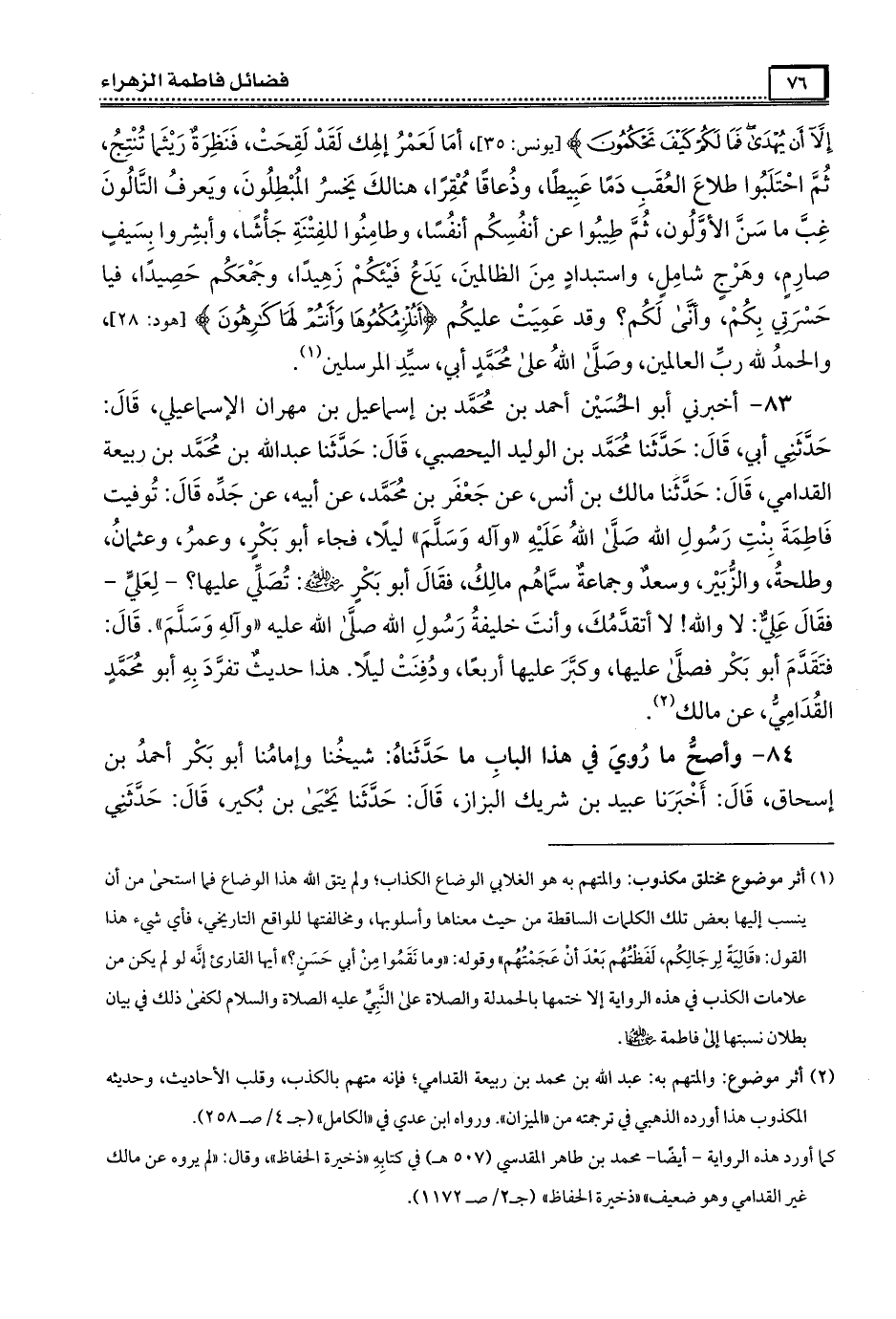 83- أَخْبَرَنِي أبو الحسين أحمد بن مُحَمَّد بن إسماعيل بن مهران الإسماعيلي ، قال : حدثني أبي ، قال : حَدَّثَنَا مُحَمَّد بن الوليد اليحصبي ، قال : حَدَّثَنَا عبد الله بن مُحَمَّد بن ربيعة القدامي ، قال : حَدَّثَنَا مالك بن أنس ، عن جعفر بن مُحَمَّد ، عن أبيه ، عن جده قال : توفيت فَاطِمَة بنت رسول الله صَلَّى الله عَلَيْهِ وَآلِهِ وَسَلَّمَ ليلا ، فجاء أبو بكر ، وعمر ، وعثمان ، وطلحة ، والزبير ، وسعد وجماعة سماهم مالك ، فقال أبو بكر رَضِىَ الله عَنْه : تصلي عليها ؟ لعلي . فقال علي : لا والله ! لا أتقدمك ، وأنت خليفة رسول الله صَلَّى الله عَلَيْهِ وَآلِهِ وَسَلَّمَ قال : فتقدم أبو بكر فصلى عليها ، وكبر عليها أربعًا ، ودفنت ليلا .