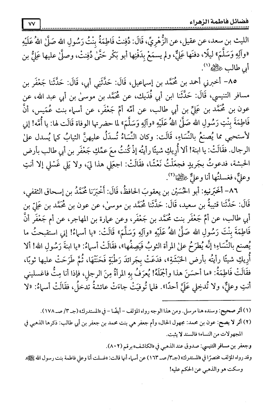85- أَخْبَرَنِي أحمد بن مُحَمَّد بن إسماعيل ، قال : حدثني أبي ، قال : حَدَّثَنَا جعفر بن مسافر التنيسي ، قال : حَدَّثَنَا ابن أبي فديك ، عن مُحَمَّد بن موسى بن أبي عبد الله ، عن عون بن مُحَمَّد بن علي بن أبي طالب ، عن أمه أم جعفر ، عن أسماء بنت عميس ، أن فَاطِمَة بنت رسول الله صَلَّى الله عَلَيْهِ وَآلِهِ وَسَلَّمَ لما حضرتها الوفاة قالت لها : يا أمه إني لأستحيي مما يصنع بالنساء ، قالت : وكان النساء تسدل عليهن الثياب كما يسدل على الرجال . فقالت : يا ابنة ألا أريك شيئا رأيته إذ كنت مع عمك جعفر بن أبي طالب بأرض الحبشة ، فدعوت بجريد فجعلت نعشا ، فقالت : اجعلي هذا لي ولا يلي غسلي إلا أنت وعلي ، فغسلتها أنا وعلي رَضِىَ الله عَنْهما .