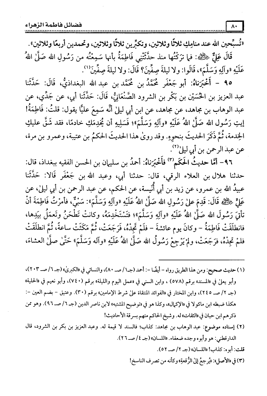 96- فأَخْبَرَنَاه أحمد بن سليمان بن الحسن الفقيه ببغداذ ، قال : حَدَّثَنَا هلال بن العلاء الرقي ، قال : حَدَّثَنَا أبي ، وعبد الله بن جعفر قالا : حَدَّثَنَا عبيد الله بن عمرو ، عن زيد بن أبي أنيسة ، عن الحكم ، عن عبد الرحمن بن أبي ليلى ، عن علي رَضِىَ الله عَنْه قال : قدم على رسول الله صَلَّى الله عَلَيْهِ وَآلِهِ وَسَلَّمَ سبي ، فأمرت فَاطِمَة أن تأتي رسول الله صَلَّى الله عَلَيْهِ وَآلِهِ وَسَلَّمَ فتستخدمه ، وكانت تطحن وتعمل بيدها ، فانطلقت فَاطِمَة ، وكان يوم عَائِشَة ، فلم تجده ، فرجعت ، ثم مكثت ساعة ، ثم انطلقت فلم تجده ، فرجعت ، ولم يرجع رسول الله صَلَّى الله عَلَيْهِ وَآلِهِ وَسَلَّمَ حتى صلى العشاء ، فقالت عَائِشَة : يا رسول الله جاءت فَاطِمَة اليوم مرارا تطلبك ، كل ذلك لا تجدك ، وكانت ليلة باردة ، فقال النبي صَلَّى الله عَلَيْهِ وَآلِهِ وَسَلَّمَ : ما جاء بها إلا حاجة أو أمر ، فخرج حتى أتى باب فَاطِمَة ، فسلم ، قال علي : وقد أخذت أنا وفَاطِمَة مضاجعنا ، فلما استأذن النبي عليه السَّلام ، تحركت لأقوم ... .