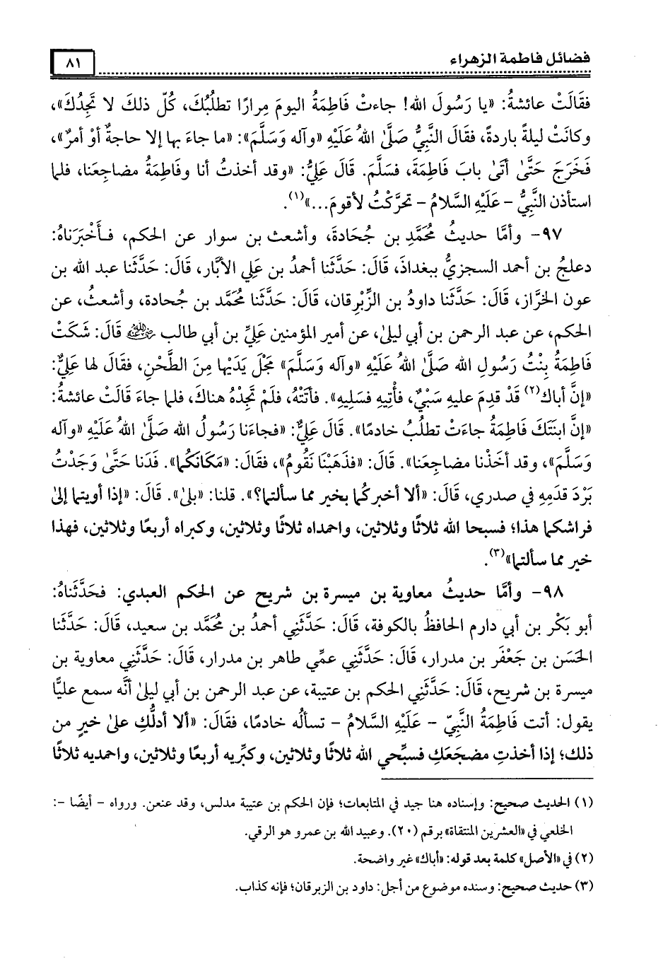 97- فأَخْبَرَنَاه : دعلج بن أحمد السجزي ببغداذ ، قال : حَدَّثَنَا أحمد بن علي الأبار ، قال : حَدَّثَنَا عبد الله بن عون الخراز ، قال : حَدَّثَنَا داود بن الزبرقان ، قال : حَدَّثَنَا مُحَمَّد بن جحادة ، وأشعث ، عن الحكم ، عن عبد الرحمن بن أبي ليلى ، عن أمير المؤمنين علي بن أبي طالب رَضِىَ الله عَنْه قال : شكت فَاطِمَة بنت رسول الله صَلَّى الله عَلَيْهِ وَآلِهِ وَسَلَّمَ مجل يديها من الطحن ، فقال لها علي : إن أباك قد قدم عليه سبي ، فأتيه فسليه ، فأتته فلم تجده هناك ، فلما جاء قالت عَائِشَة : إن ابنتك فَاطِمَة جاءت تطلب خادما ، قال علي : فجاءنا رسول الله صَلَّى الله عَلَيْهِ وَآلِهِ وَسَلَّمَ ، وقد أخذنا مضاجعنا ، قال : فذهبنا نقوم ، فقال : مكانكما ، فدنا حتى وجدت برد قدمه في صدري ، قال : ألا أخبركما بخير مما سألتما ؟ قلنا بلى . قال : إذا أويتما إلى فراشكما هذا ، فسبحا الله ثلاثًا وثلاثين ، واحمداه ثلاثًا وثلاثين ، وكبراه أربعًا وثلاثين ، فهذا خير مما سألتما .