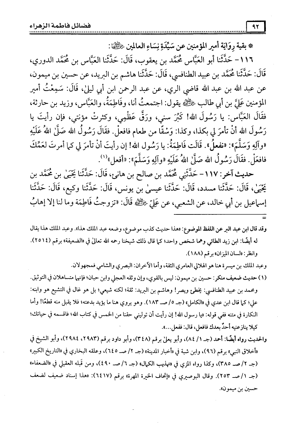 116- حَدَّثَنَا أبو العباس مُحَمَّد بن يعقوب ، قال : حَدَّثَنَا العباس بن مُحَمَّد الدوري ، قال : حَدَّثَنَا مُحَمَّد بن عبيد الطنافسي ، قال : حَدَّثَنَا هاشم بن البريد عن حسين بن ميمون عن عبد الله بن عبد الله قاضي الري عن عبد الرحمن بن أبي ليلى قال سمعت أمير المؤمنين علي بن أبي طالب رَضِىَ الله عَنْه يقول : اجتمعت أنا و فَاطِمَة والعباس وزيد بن حارثة فقال العباس : يا رسول الله ، كبر سني ورق عظمي وكثرت مؤنتي فإن رأيت يا رسول الله أن تأمر لي بكذا وكذا وسقًا من طعام فافعل ، فقال رسول الله صَلَّى الله عَلَيْهِ وَآلِهِ وَسَلَّمَ نفعل قالت فَاطِمَة يا رسول الله إن رأيت أن تأمر لي كما أمرت لعمك فافعل ، فقال رسول الله صَلَّى الله عَلَيْهِ وَآلِهِ وَسَلَّمَ افعل .