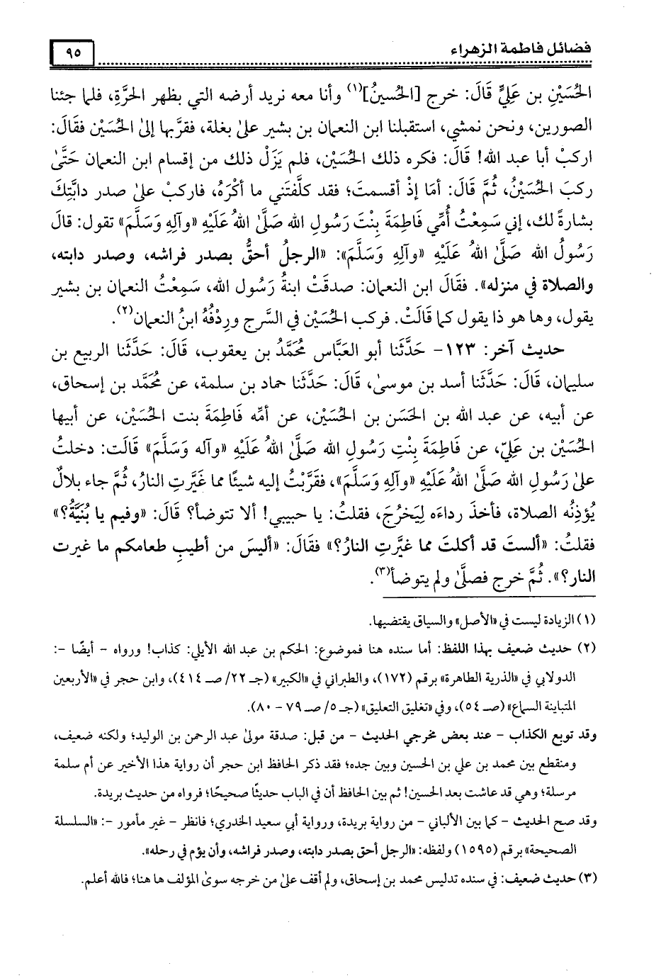 123- حَدَّثَنَا أبو العباس مُحَمَّد بن يعقوب ، قال : حَدَّثَنَا الربيع بن سليمان ، قال : حَدَّثَنَا أسد بن موسى ، قال : حَدَّثَنَا حماد بن سلمة عن مُحَمَّد بن إسحاق عن أبيه عن عبد الله بن الحسن بن الحسين عن أمه فَاطِمَة بنت الحسين عن أبيها الحسين بن علي عن فَاطِمَة بنت رسول الله صَلَّى الله عَلَيْهِ وَآلِهِ وَسَلَّمَ قالت دخلت على رسول الله صَلَّى الله عَلَيْهِ وَآلِهِ وَسَلَّمَ فقربت إليه شيئا مما غيرت النار ثم جاء بلال يؤذنه الصَّلاة ، فأخذ رداءه ليخرج فقلت يا حبيبي ألا تتوضأ ؟ قال وفيم يا بنية فقلت ألست قد أكلت مما غيرت النار ؟ فقال : أليس من أطيب طعامكم ما غيرت النار ، ثم خرج فصلى ولم يتوضأ .