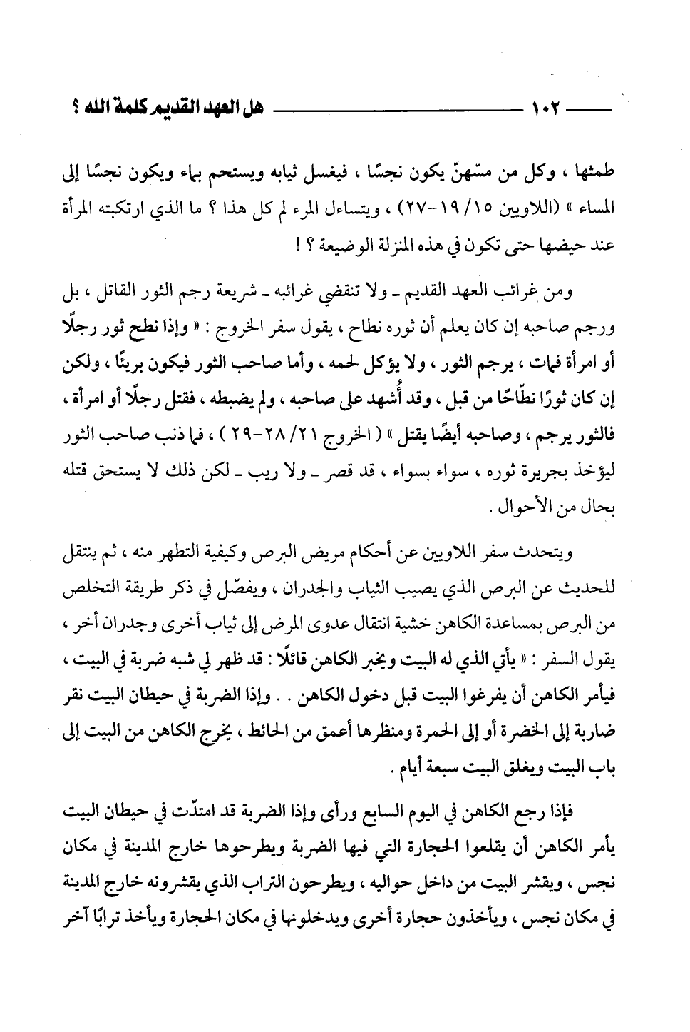 ومن غرائب العهد القديم - ولا تنقضي غرائبه - شريعة رجم الثور القاتل، بل ورجم صاحبه إن كان يعلم أن ثوره نطاح، يقول سفر الخروج: "وإذا نطح ثور رجلاً أو امرأة فمات، يرجم الثور، ولا يؤكل لحمه، وأما صاحب الثور فيكون بريئاً، ولكن إن كان ثوراً نطّاحاً من قبل، وقد أُشهد على صاحبه، ولم يضبطه، فقتل رجلاً أو امرأة، فالثور يرجم، وصاحبه أيضاً يقتل" (الخروج 21/ 28 - 29)، فما ذنب صاحب الثور ليؤخذ بجريرة ثوره، سواء بسواء، قد قصر - ولا ريب - لكن ذلك لا يستحق قتله بحال من الأحوال.
