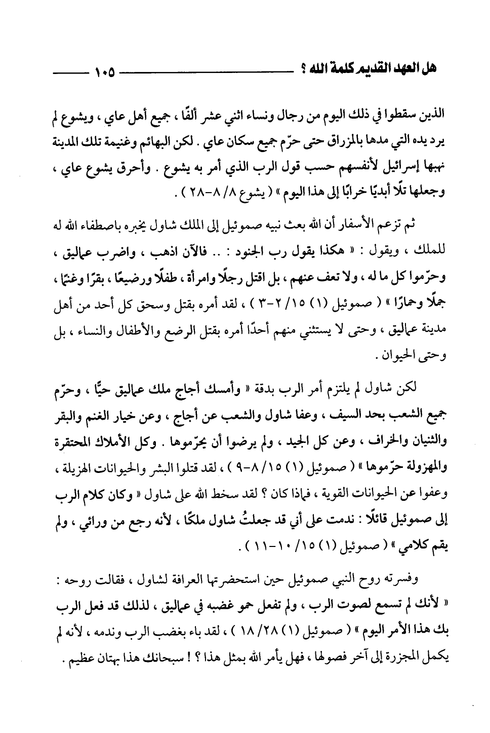 ثم تزعم الأسفار أن الله بعث نبيه صموئيل إلى الملك شاول يخبره باصطفاء الله له للملك، ويقول: " هكذا يقول رب الجنود: ... فالآن اذهب، واضرب عماليق، وحرّموا كل ما له، ولا تعف عنهم، بل اقتل رجلاً وامرأة، طفلاً ورضيعاً، بقراً وغنماً، جملاً وحماراً" (صموئيل (1) 15/ 2 - 3)، لقد أمره بقتل وسحق كل أحد من أهل مدينة عماليق، وحتى لا يستثني منهم أحداً أمره بقتل الرضع والأطفال والنساء، بل وحتى الحيوان.