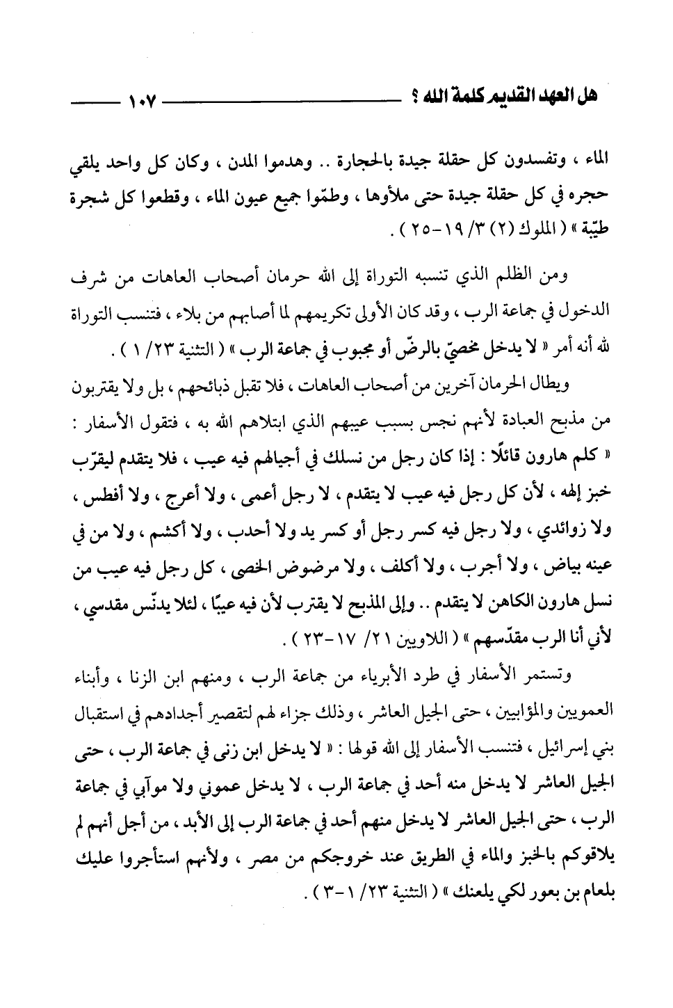 وتستمر الأسفار في طرد الأبرياء من جماعة الرب، ومنهم ابن الزنا، وأبناء العمويين والمؤابيين، حتى الجيل العاشر، وذلك جزاء لهم لتقصير أجدادهم في استقبال بني إسرائيل، فتنسب الأسفار إلى الله قولها: "لا يدخل ابن زنى في جماعة الرب، حتى الجيل العاشر لا يدخل منه أحد في جماعة الرب، لا يدخل عموني ولا موآبي في جماعة الرب، حتى الجيل العاشر لا يدخل منهم أحد في جماعة الرب إلى الأبد، من أجل أنهم لم يلاقوكم بالخبز والماء في الطريق عند خروجكم من مصر، ولأنهم استأجروا عليك بلعام بن بعور لكي يلعنك" (التثنية 23/ 1 - 3).
