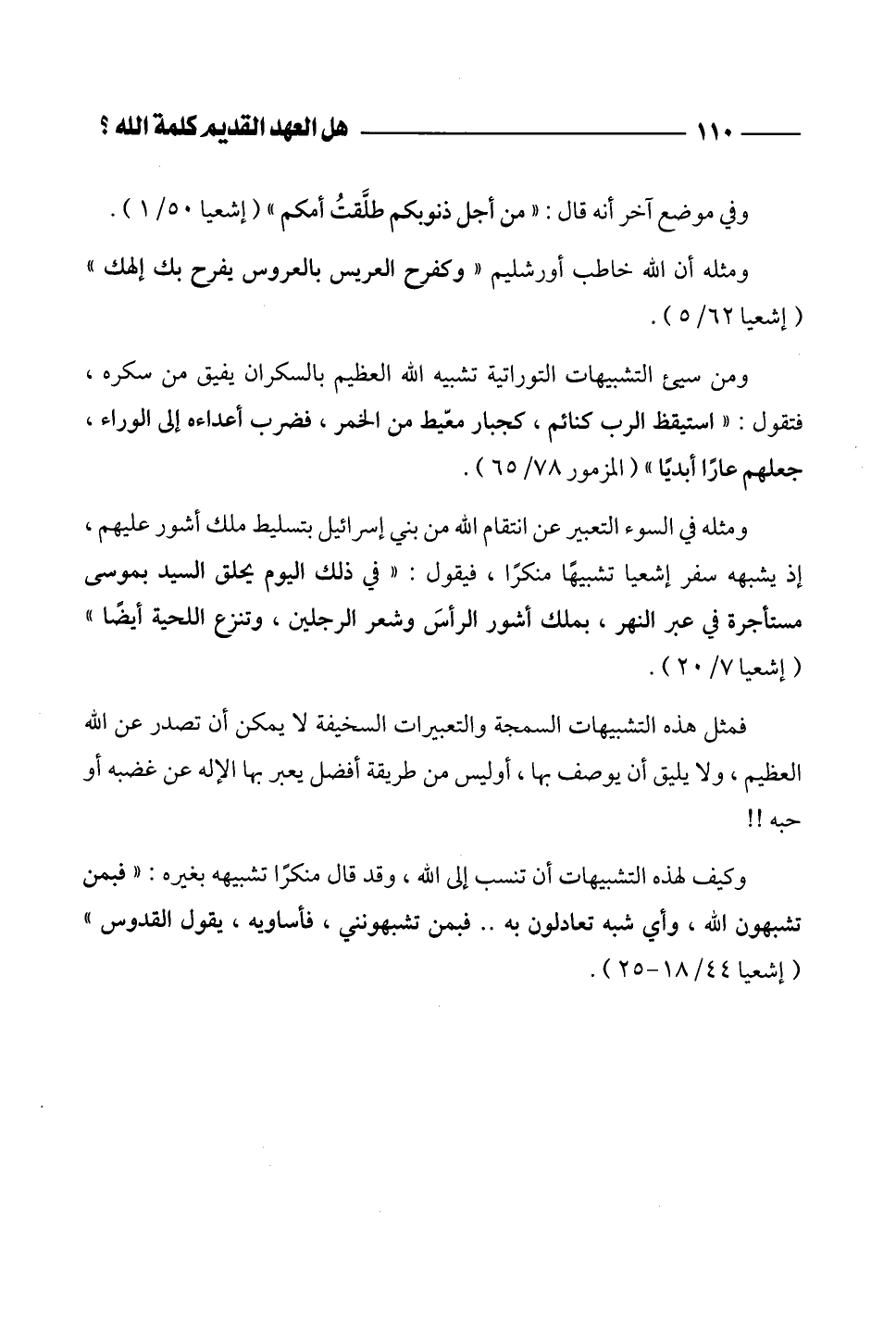 وكيف لهذه التشبيهات أن تنسب إلى الله، وقد قال منكراً تشبيهه بغيره: "فبمن تشبهون الله، وأي شبه تعادلون به .. فبمن تشبهونني، فأساويه، يقول القدوس" (إشعيا 44/ 18 - 25).