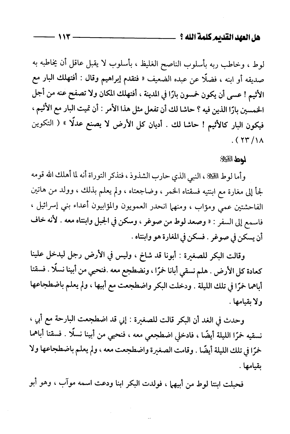 لوط، وخاطب ربه بأسلوب الناصح الغليظ، بأسلوب لا يقبل عاقل أن يخاطبه به صديقه أو ابنه، فضلاً عن عبده الضعيف "فتقدم إبراهيم وقال: أفتهلك البار مع الأثيم! عسى أن يكون خمسون باراً في المدينة، أفتهلك المكان ولا تصفح عنه من أجل الخمسين باراً الذين فيه؟ حاشا لك أن تفعل مثل هذا الأمر: أن تميت البار مع الأثيم، فيكون البار كالأثيم! حاشا لك. أديان كل الأرض لا يصنع عدلاً" (التكوين 18/ 23).