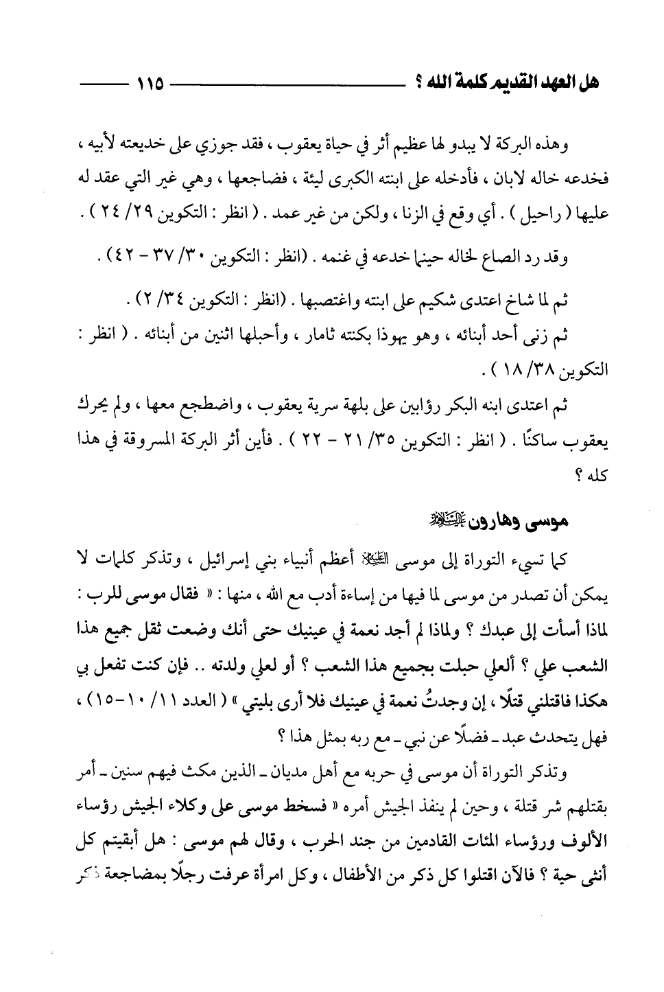 كما تسيء التوراة إلى موسى - عليه السلام - أعظم أنبياء بني إسرائيل، وتذكر كلمات لا يمكن أن تصدر من موسى لما فيها من إساءة أدب مع الله، منها: " فقال موسى للرب: لماذا أسأت إلى عبدك؟ ولماذا لم أجد نعمة في عينيك حتى أنك وضعت ثقل جميع هذا الشعب علي؟ ألعلي حبلت بجميع هذا الشعب؟ أو لعلي ولدته .. فإن كنت تفعل بي هكذا فاقتلني قتلاً، إن وجدتُ نعمة في عينيك فلا أرى بليتي " (العدد 11/ 10 - 15)، فهل يتحدث عبد - فضلاً عن نبي - مع ربه بمثل هذا؟