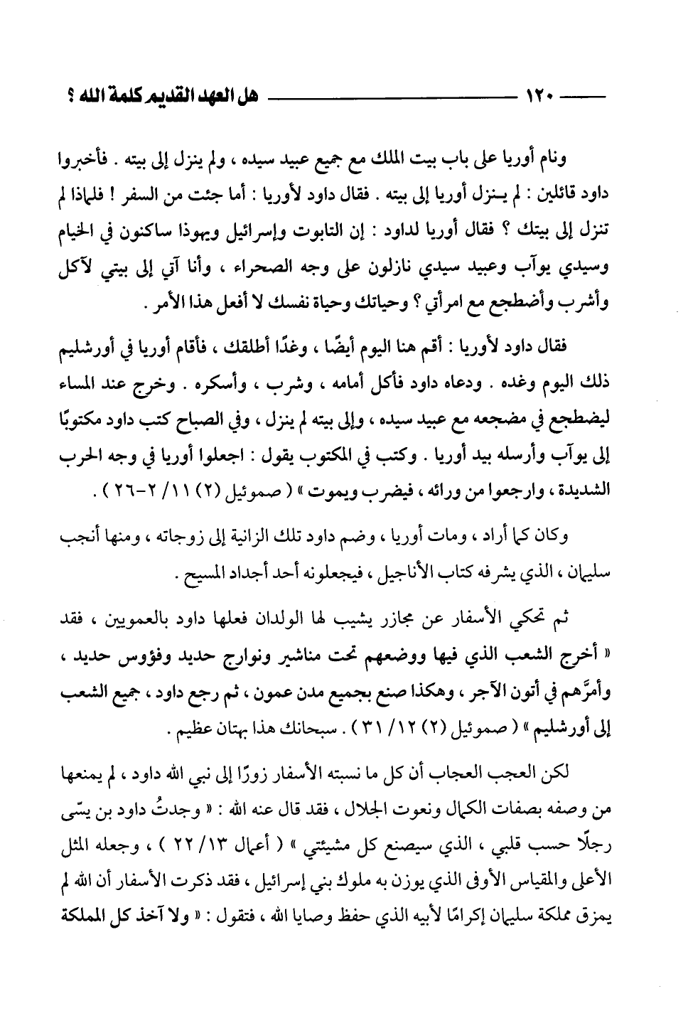 ونام أوريا على باب بيت الملك مع جميع عبيد سيده، ولم ينزل إلى بيته. فأخبروا داود قائلين: لم ينزل أوريا إلى بيته. فقال داود لأوريا: أما جئت من السفر! فلماذا لم تنزل إلى بيتك؟ فقال أوريا لداود: إن التابوت وإسرائيل ويهوذا ساكنون في الخيام وسيدي يوآب وعبيد سيدي نازلون على وجه الصحراء، وأنا آتي إلى بيتي لآكل وأشرب وأضطجع مع امرأتي؟ وحياتك وحياة نفسك لا أفعل هذا الأمر.