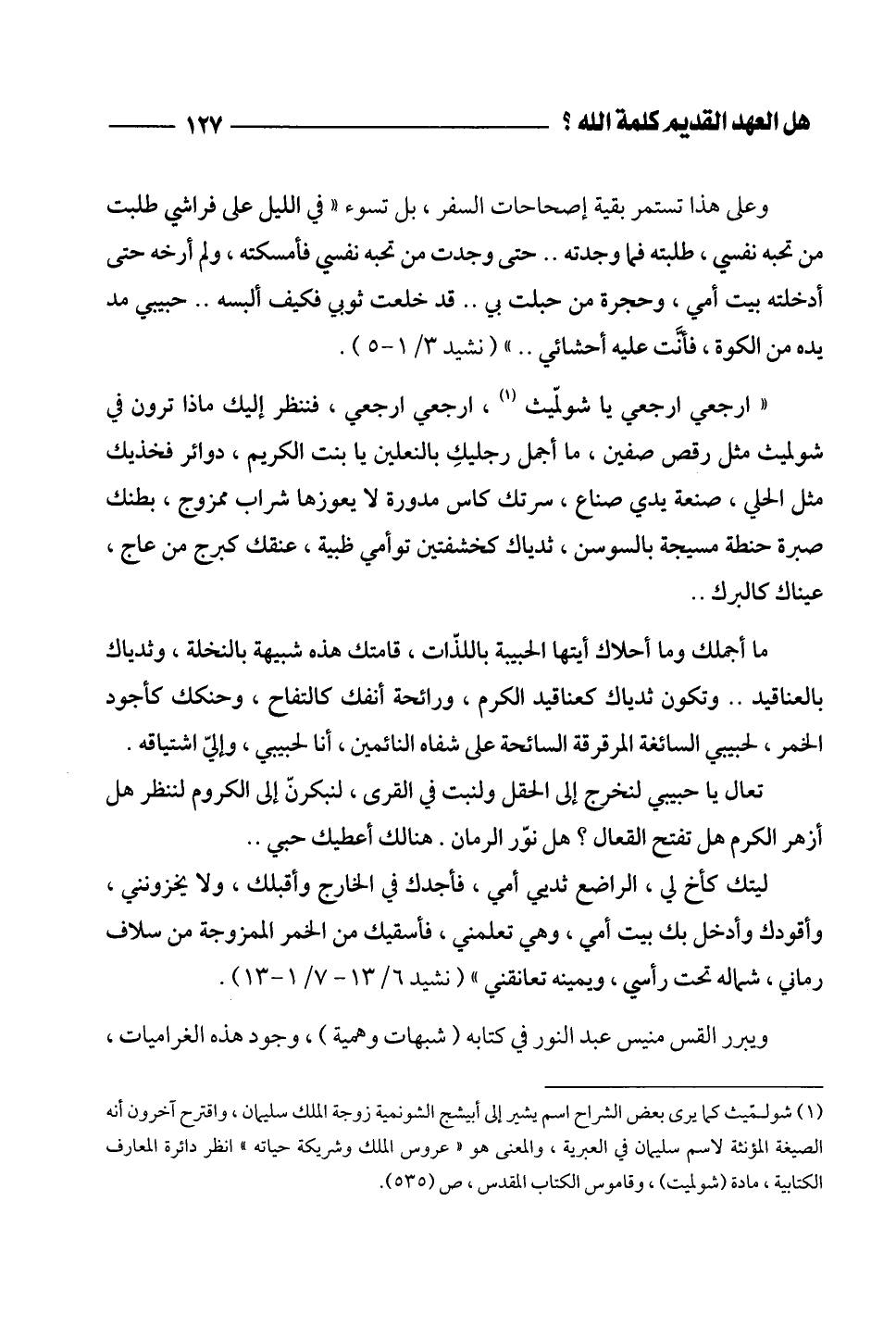 (¬1) شولمّيث كما يرى بعض الشراح اسم يشير إلى أبيشج الشونمية زوجة الملك سليمان، واقترح آخرون أنه الصيغة المؤنثة لاسم سليمان في العبرية، والمعنى هو "عروس الملك وشريكة حياته" انظر دائرة المعارف الكتابية، مادة (شولميت)، وقاموس الكتاب المقدس، ص (535).