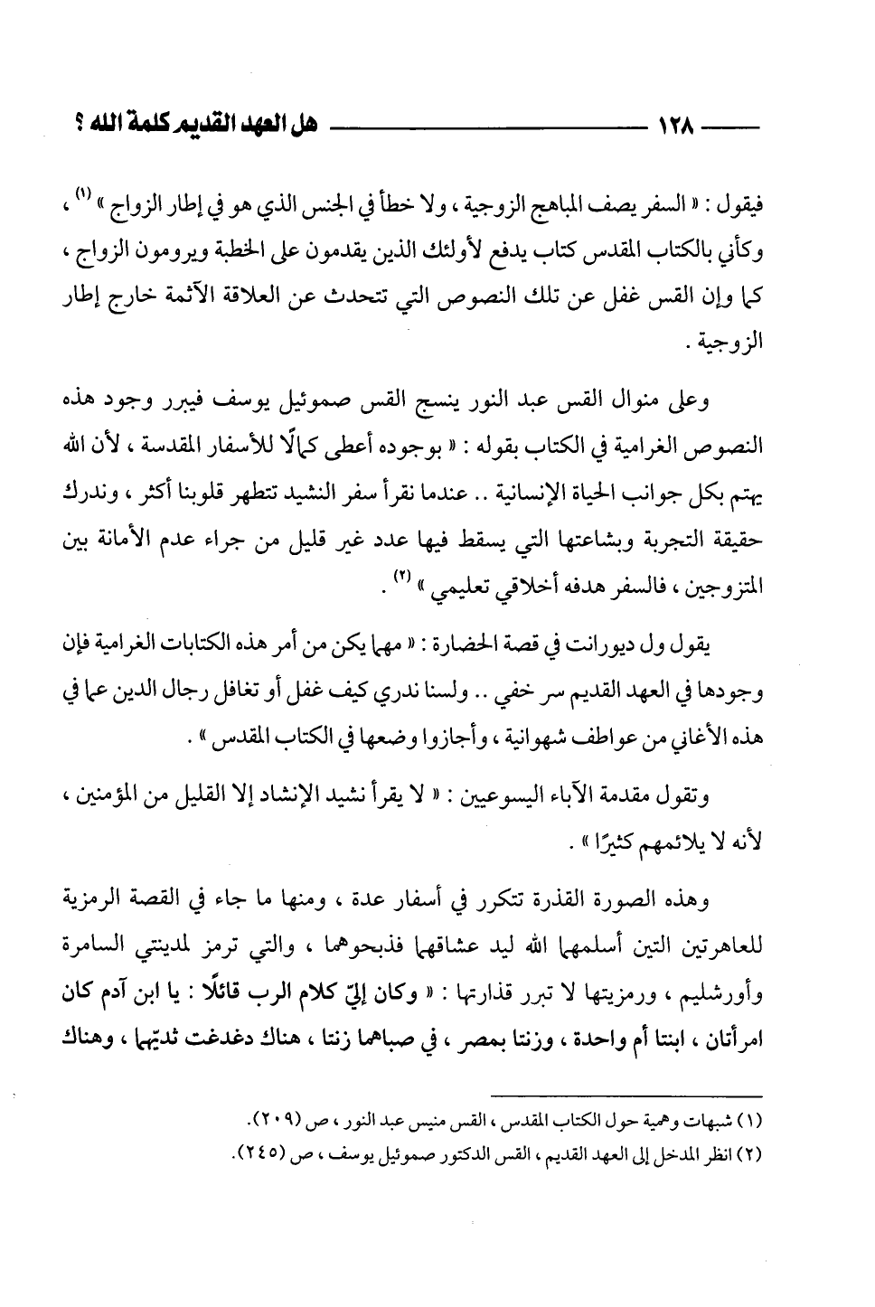 فيقول: "السفر يصف المباهج الزوجية، ولا خطأ في الجنس الذي هو في إطار الزواج" (¬1)، وكأني بالكتاب المقدس كتاب يدفع لأولئك الذين يقدمون على الخطبة ويرومون الزواج، كما وإن القس غفل عن تلك النصوص التي تتحدث عن العلاقة الآثمة خارج إطار الزوجية.