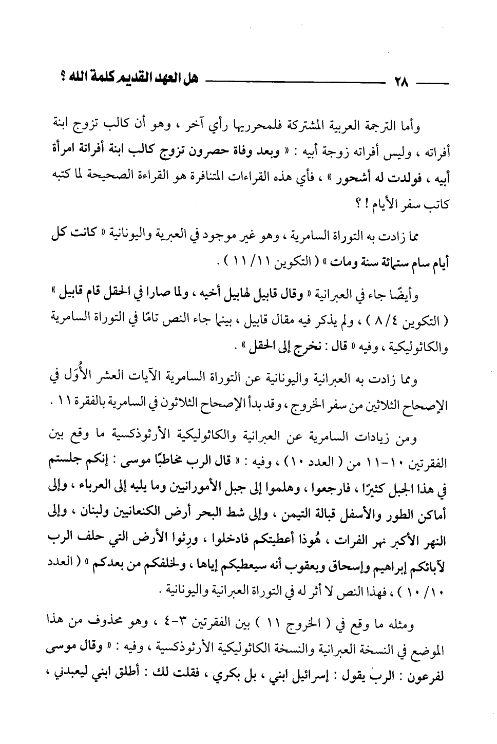 - ومثله ما وقع في (الخروج 11) بين الفقرتين 3 - 4، وهو محذوف من هذا الموضع في النسخة العبرانية والنسخة الكاثوليكية الأرثوذكسية، وفيه: "وقال موسى لفرعون: الرب يقول: إسرائيل ابني، بل بكري، فقلت لك: أطلق ابني ليعبدني،