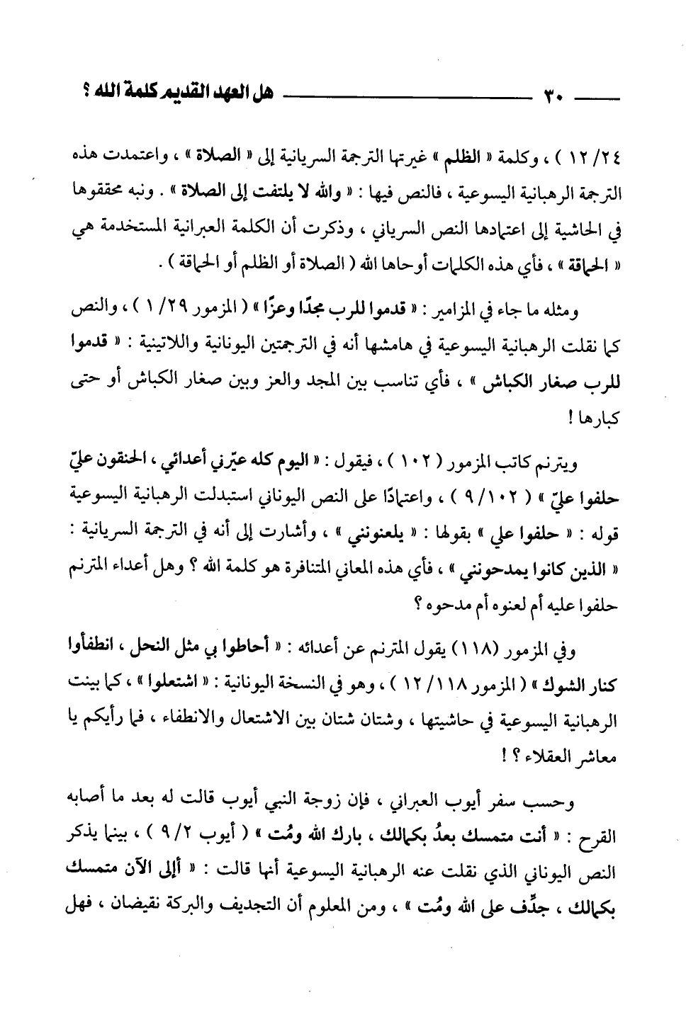 ويترنم كاتب المزمور (102)، فيقول: "اليوم كله عيّرني أعدائي، الحنقون عليّ حلفوا عليّ" (102/ 9)، واعتماداً على النص اليوناني استبدلت الرهبانية اليسوعية قوله: "حلفوا علي" بقولها: "يلعنونني"، وأشارت إلى أنه في الترجمة السريانية: "الذين كانوا يمدحونني"، فأي هذه المعاني المتنافرة هو كلمة الله؟ وهل أعداء المترنم حلفوا عليه أم لعنوه أم مدحوه؟