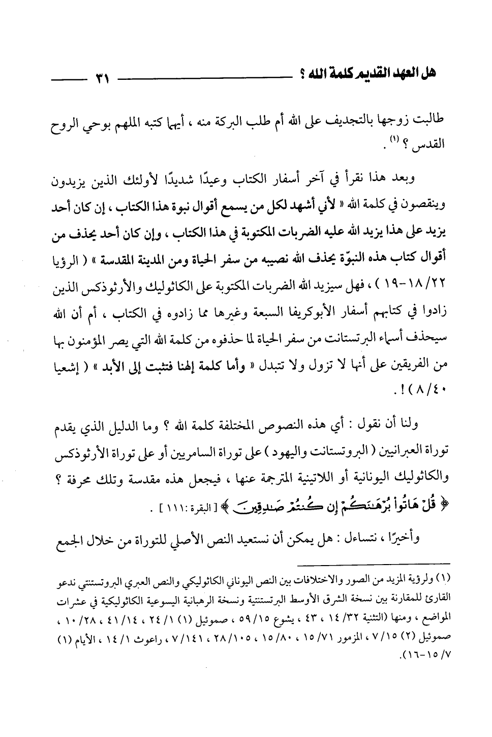ولنا أن نقول: أي هذه النصوص المختلفة كلمة الله؟ وما الدليل الذي يقدم توراة العبرانيين (البروتستانت واليهود) على توراة السامريين أو على توراة الأرثوذكس والكاثوليك اليونانية أو اللاتينية المترجمة عنها، فيجعل هذه مقدسة وتلك محرفة؟ {قل هاتوا برهانكم إن كنتم صادقين} (البقرة:111).