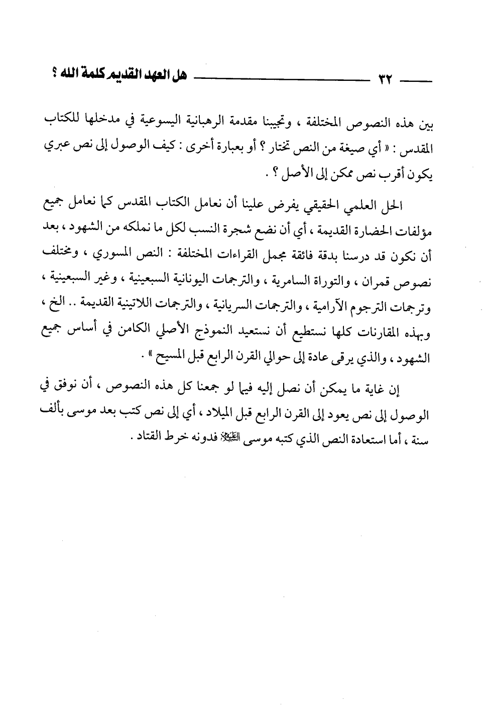 الحل العلمي الحقيقي يفرض علينا أن نعامل الكتاب المقدس كما نعامل جميع مؤلفات الحضارة القديمة، أي أن نضع شجرة النسب لكل ما نملكه من الشهود، بعد أن نكون قد درسنا بدقة فائقة مجمل القراءات المختلفة: النص المسوري، ومختلف نصوص قمران، والتوراة السامرية، والترجمات اليونانية السبعينية، وغير السبعينية، وترجمات الترجوم الآرامية، والترجمات السريانية، والترجمات اللاتينية القديمة ... الخ، وبهذه المقارنات كلها نستطيع أن نستعيد النموذج الأصلي الكامن في أساس جميع الشهود، والذي يرقى عادة إلى حوالي القرن الرابع قبل المسيح ".