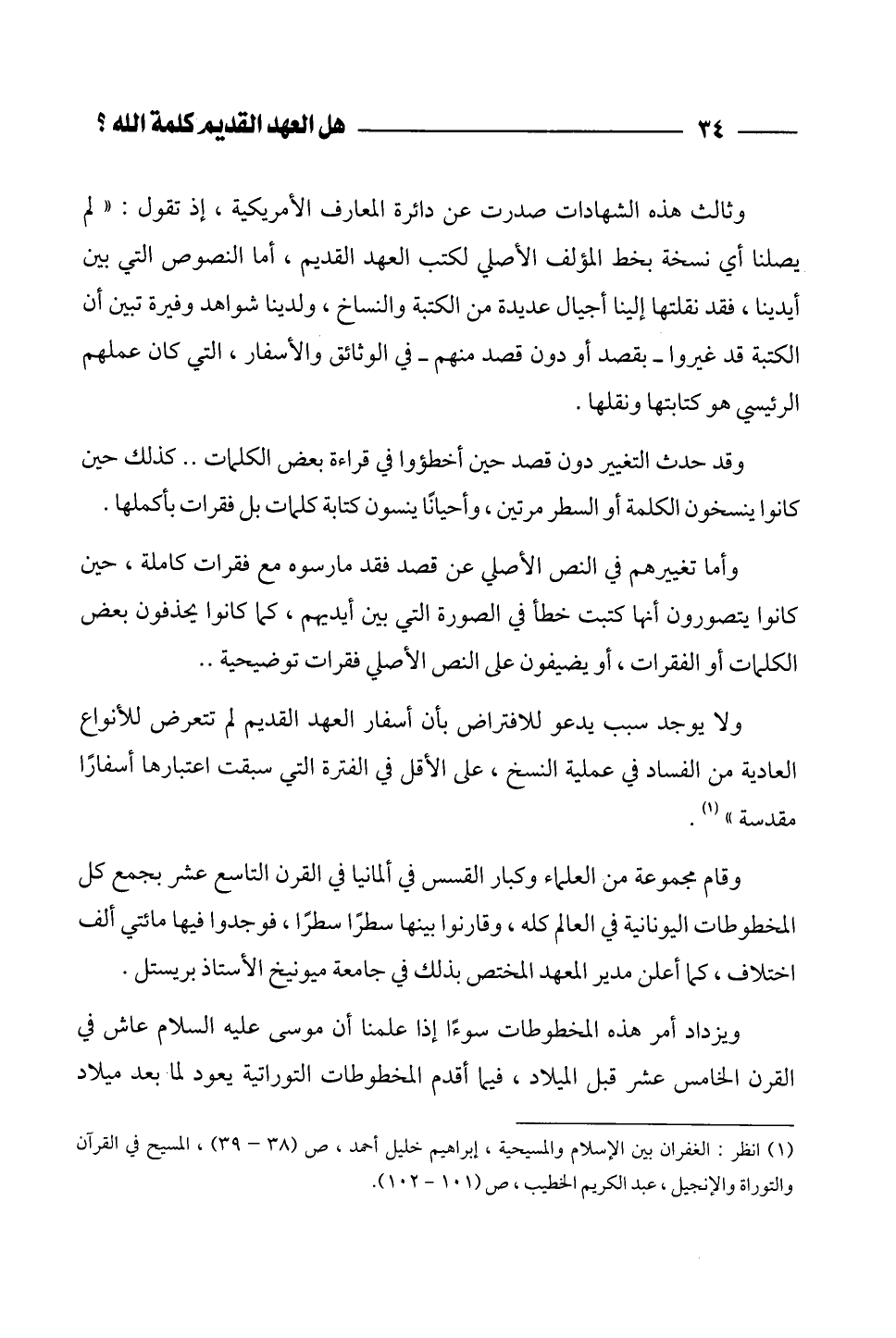 وثالث هذه الشهادات صدرت عن دائرة المعارف الأمريكية، إذ تقول: "لم يصلنا أي نسخة بخط المؤلف الأصلي لكتب العهد القديم، أما النصوص التي بين أيدينا، فقد نقلتها إلينا أجيال عديدة من الكتبة والنساخ، ولدينا شواهد وفيرة تبين أن الكتبة قد غيروا - بقصد أو دون قصد منهم - في الوثائق والأسفار، التي كان عملهم الرئيسي هو كتابتها ونقلها.