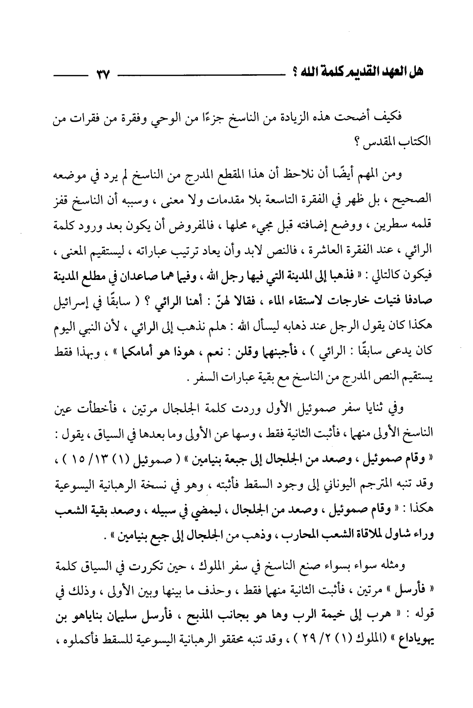 ومن المهم أيضاً أن نلاحظ أن هذا المقطع المدرج من الناسخ لم يرد في موضعه الصحيح، بل ظهر في الفقرة التاسعة بلا مقدمات ولا معنى، وسببه أن الناسخ قفز قلمه سطرين، ووضع إضافته قبل مجيء محلها، فالمفروض أن يكون بعد ورود كلمة الرائي، عند الفقرة العاشرة، فالنص لابد وأن يعاد ترتيب عباراته، ليستقيم المعنى، فيكون كالتالي: " فذهبا إلى المدينة التي فيها رجل الله، وفيما هما صاعدان في مطلع المدينة صادفا فتيات خارجات لاستقاء الماء، فقالا لهنّ: أهنا الرائي؟ (سابقاً في إسرائيل هكذا كان يقول الرجل عند ذهابه ليسأل الله: هلم نذهب إلى الرائي، لأن النبي اليوم كان يدعى سابقاً: الرائي)، فأجبنهما وقلن: نعم، هوذا هو أمامكما"، وبهذا فقط يستقيم النص المدرج من الناسخ مع بقية عبارات السفر.
