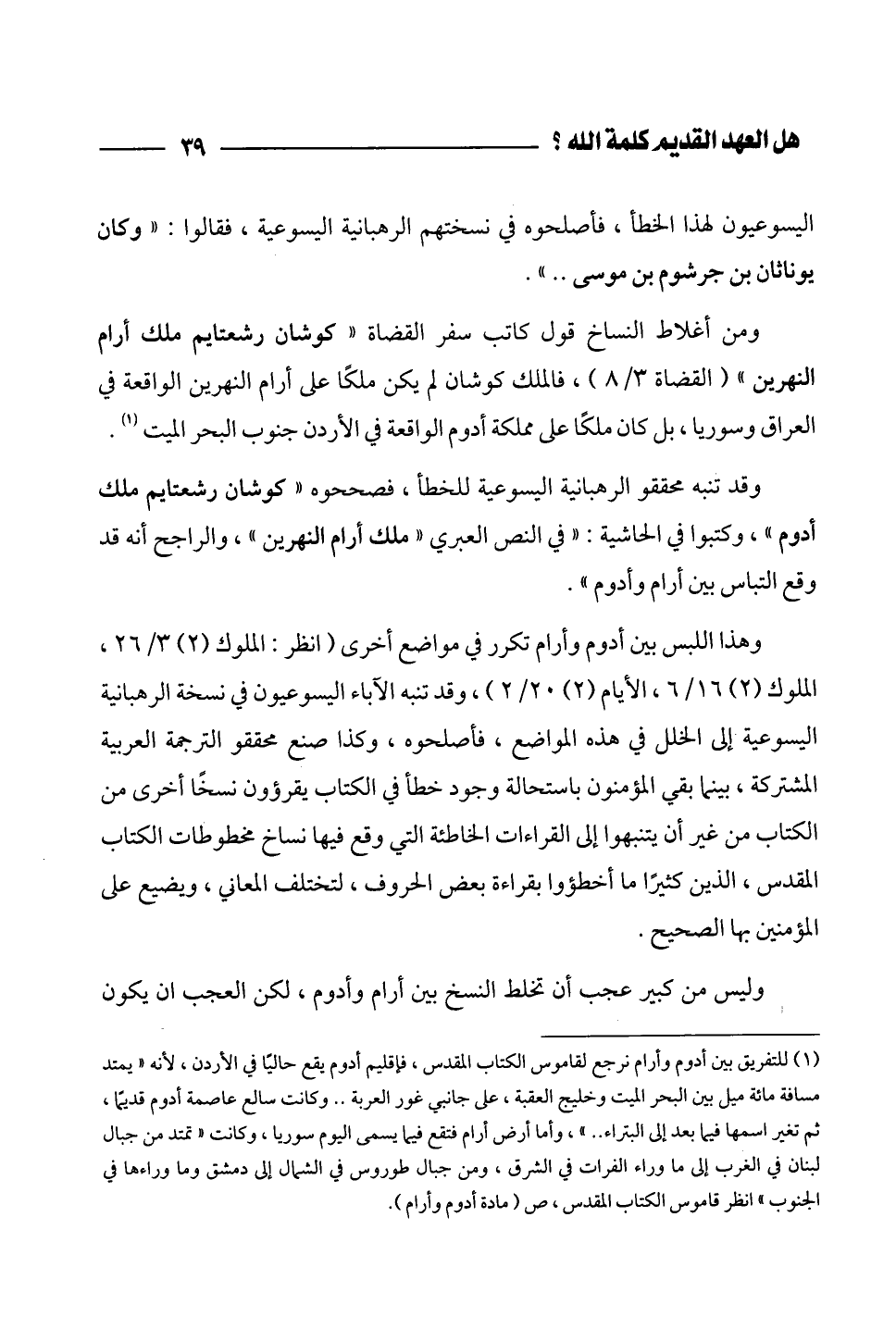 وقد تنبه محققو الرهبانية اليسوعية للخطأ، فصححوه "كوشان رشعتايم ملك أدوم"، وكتبوا في الحاشية: "في النص العبري "ملك أرام النهرين"، والراجح أنه قد وقع التباس بين أرام وأدوم".