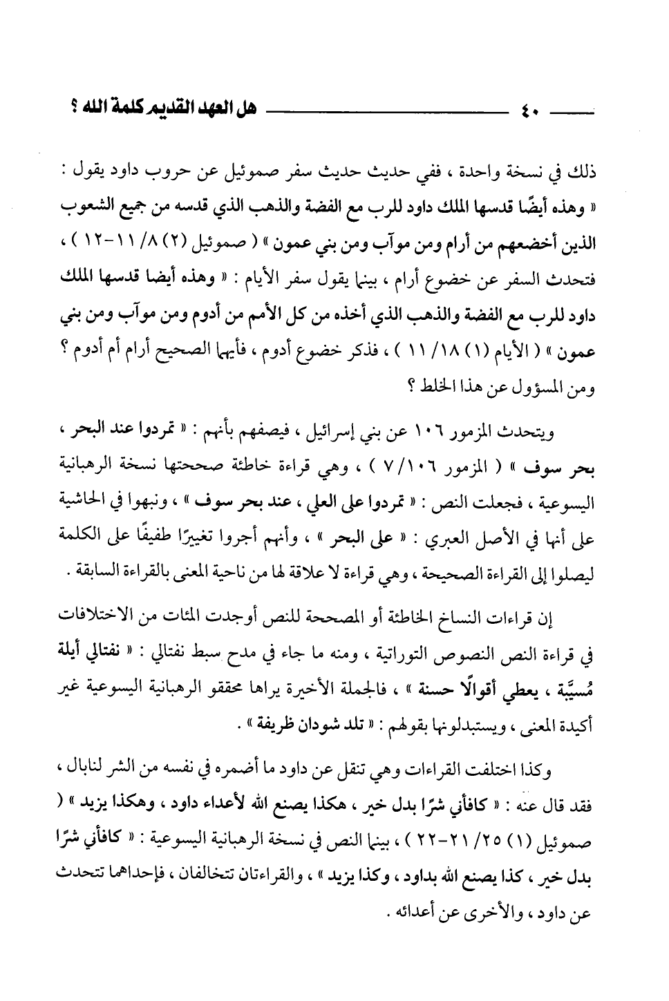 - وكذا اختلفت القراءات وهي تنقل عن داود ما أضمره في نفسه من الشر لنابال، فقد قال عنه: "كافأني شراً بدل خير، هكذا يصنع الله لأعداء داود، وهكذا يزيد" (صموئيل (1) 25/ 21 - 22)، بينما النص في نسخة الرهبانية اليسوعية: " كافأني شراً بدل خير، كذا يصنع الله بداود، وكذا يزيد "، والقراءتان تتخالفان، فإحداهما تتحدث عن داود، والأخرى عن أعدائه.