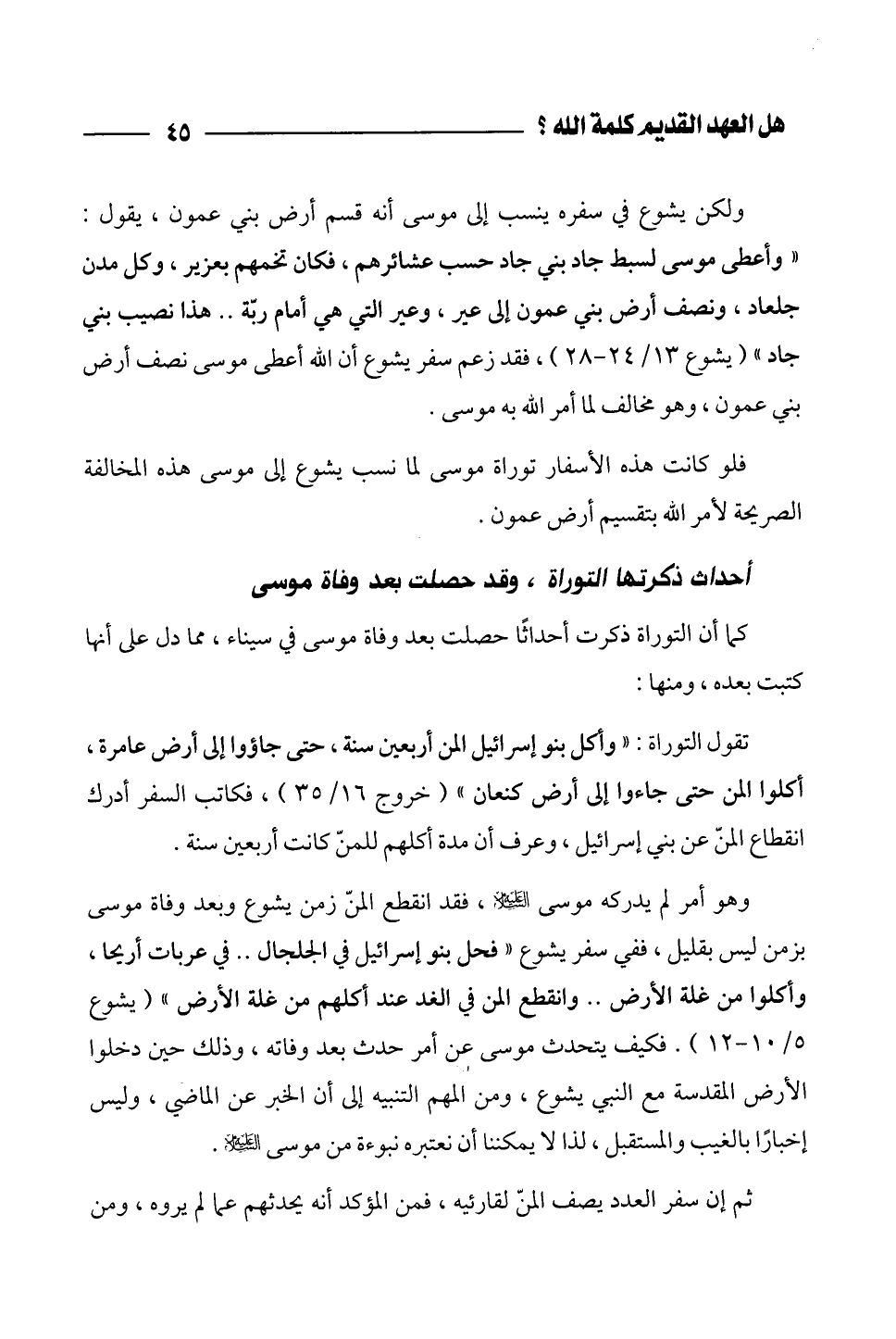 وهو أمر لم يدركه موسى عليه السلام، فقد انقطع المنّ زمن يشوع وبعد وفاة موسى بزمن ليس بقليل، ففي سفر يشوع " فحل بنو إسرائيل في الجلجال .. في عربات أريحا، وأكلوا من غلة الأرض .. وانقطع المن في الغد عند أكلهم من غلة الأرض " (يشوع 5/ 10 - 12). فكيف يتحدث موسى عن أمر حدث بعد وفاته، وذلك حين دخلوا الأرض المقدسة مع النبي يشوع، ومن المهم التنبيه إلى أن الخبر عن الماضي، وليس إخباراً بالغيب والمستقبل، لذا لا يمكننا أن نعتبره نبوءة من موسى عليه السلام.