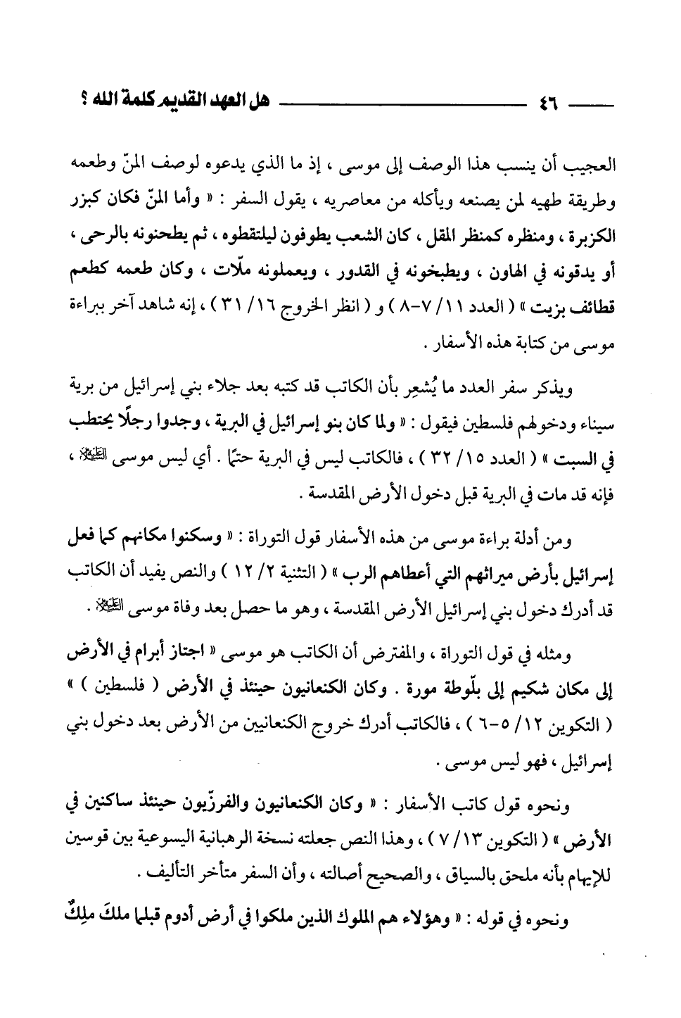 - ومن أدلة براءة موسى من هذه الأسفار قول التوراة: " وسكنوا مكانهم كما فعل إسرائيل بأرض ميراثهم التي أعطاهم الرب" (التثنية 2/ 12) والنص يفيد أن الكاتب قد أدرك دخول بني إسرائيل الأرض المقدسة، وهو ما حصل بعد وفاة موسى عليه السلام.