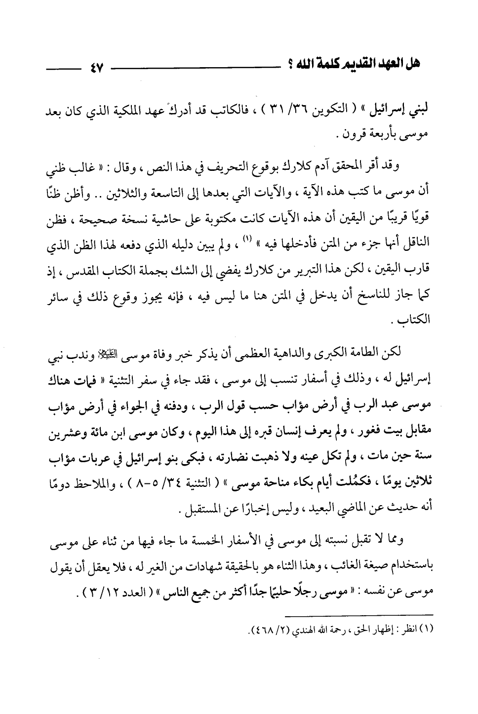 وقد أقر المحقق آدم كلارك بوقوع التحريف في هذا النص، وقال: " غالب ظني أن موسى ما كتب هذه الآية، والآيات التي بعدها إلى التاسعة والثلاثين .. وأظن ظناً قوياً قريباً من اليقين أن هذه الآيات كانت مكتوبة على حاشية نسخة صحيحة، فظن الناقل أنها جزء من المتن فأدخلها فيه " (¬1)، ولم يبين دليله الذي دفعه لهذا الظن الذي قارب اليقين، لكن هذا التبرير من كلارك يفضي إلى الشك بجملة الكتاب المقدس، إذ كما جاز للناسخ أن يدخل في المتن هنا ما ليس فيه، فإنه يجوز وقوع ذلك في سائر الكتاب ..