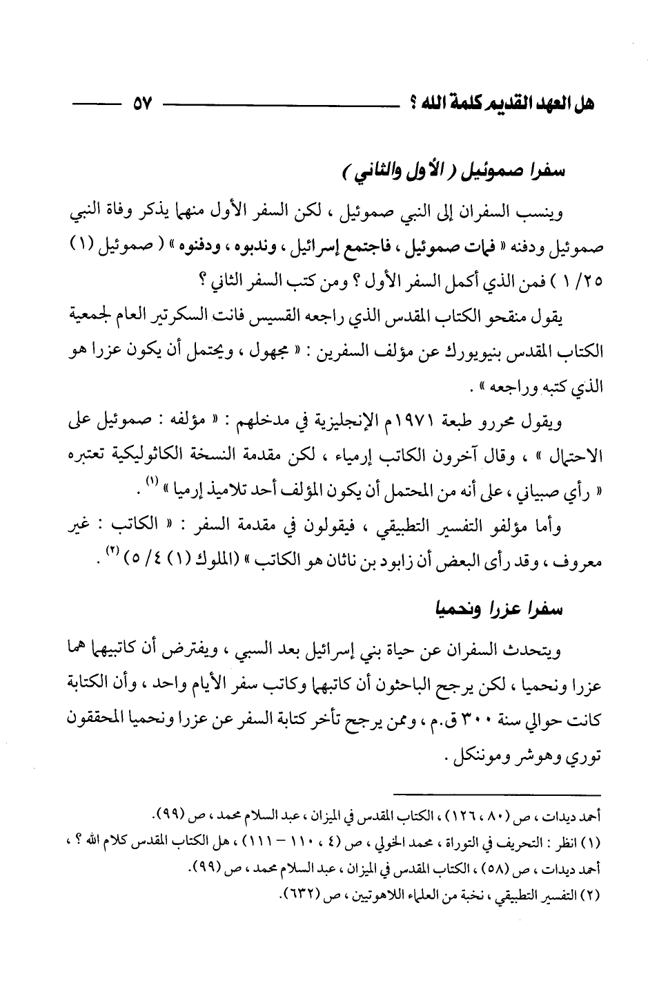 (¬1) انظر: التحريف في التوراة، محمد الخولي، ص (4، 110 - 111)، هل الكتاب المقدس كلام الله؟، أحمد ديدات، ص (58)، الكتاب المقدس في الميزان، عبد السلام محمد، ص (99).