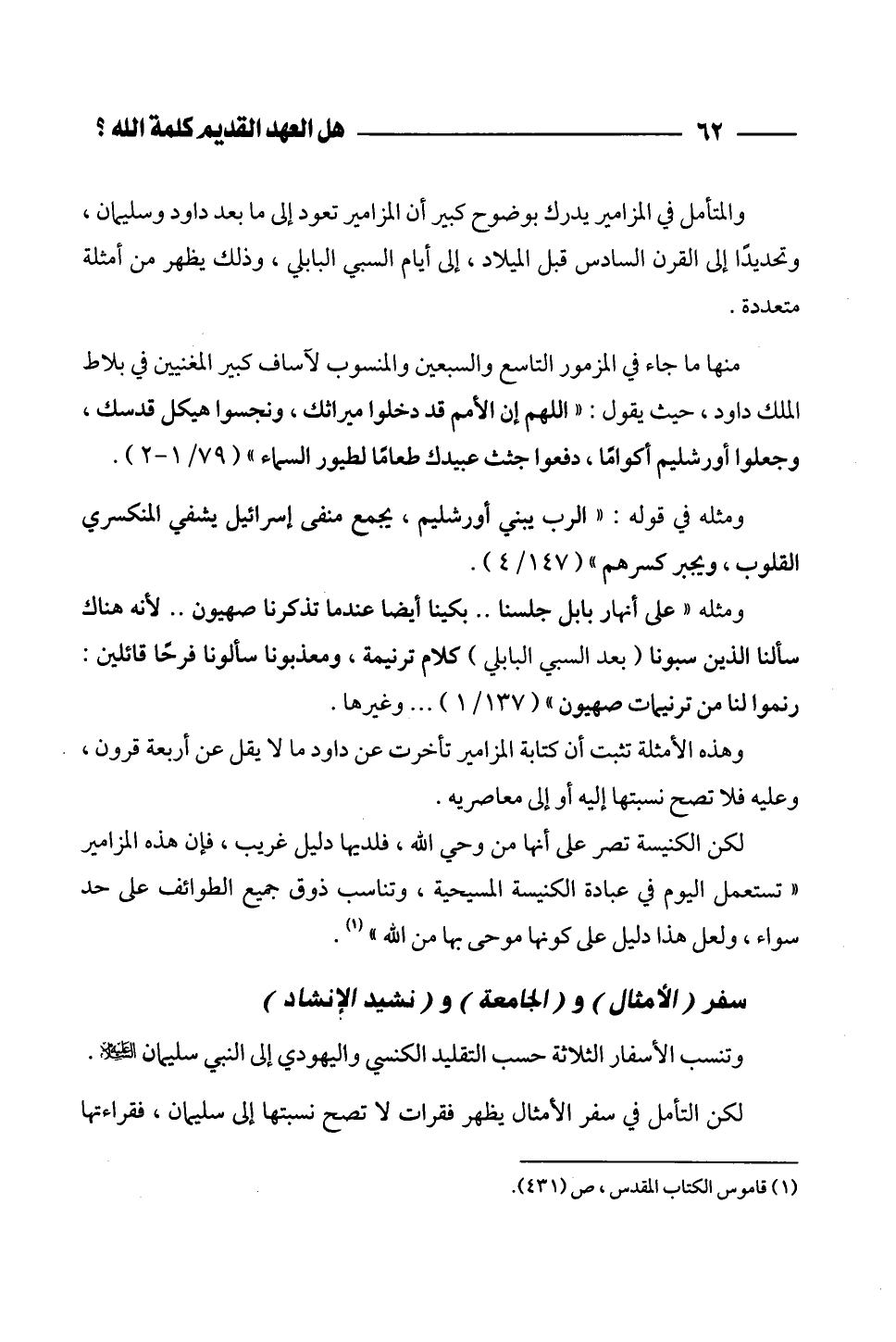وهذه الأمثلة تثبت أن كتابة المزامير تأخرت عن داود ما لا يقل عن أربعة قرون، وعليه فلا تصح نسبتها إليه أو إلى معاصريه.