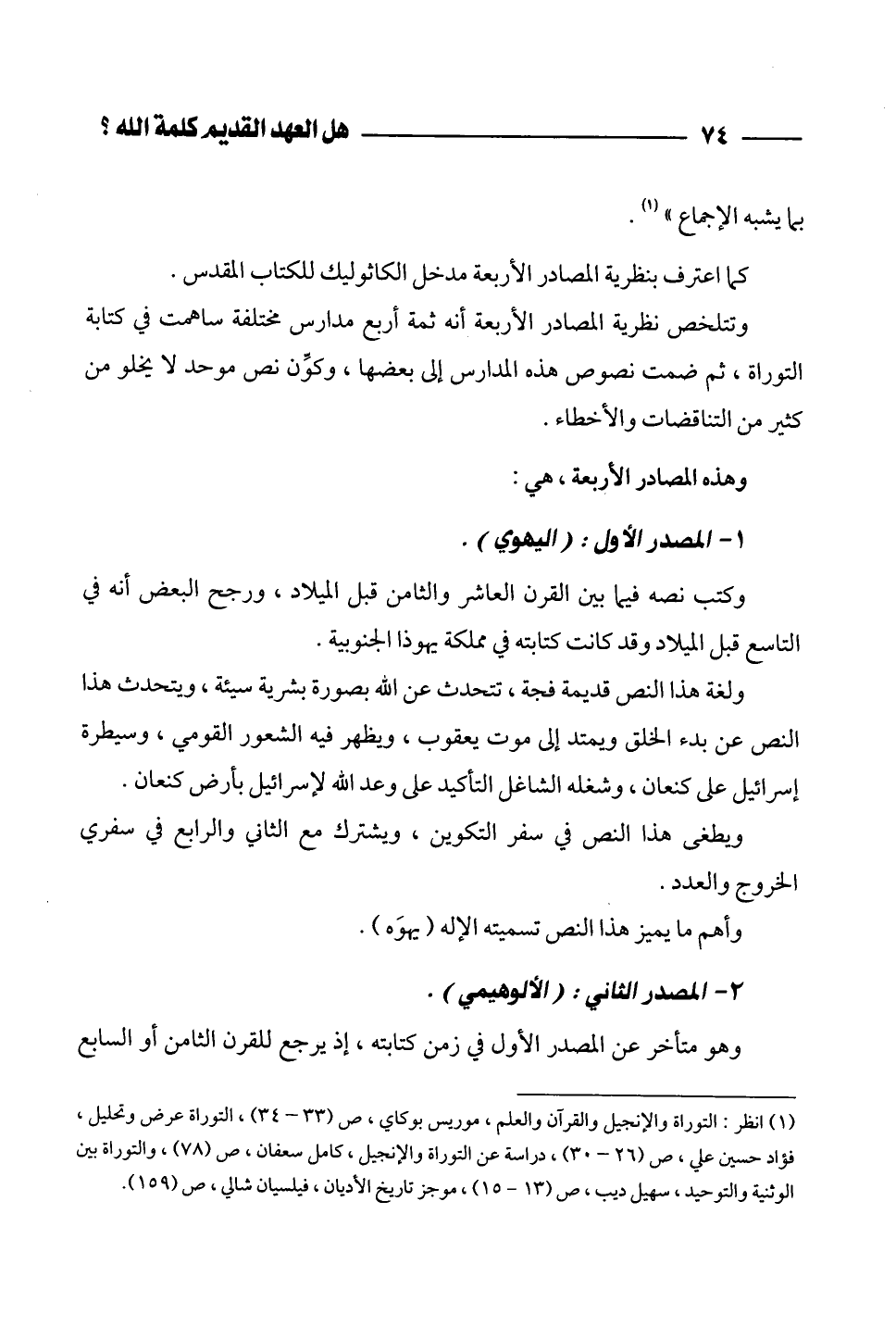 (¬1) انظر: التوراة والإنجيل والقرآن والعلم، موريس بوكاي، ص (33 - 34)، التوراة عرض وتحليل، فؤاد حسين علي، ص (26 - 30)، دراسة عن التوراة والإنجيل، كامل سعفان، ص (78)، والتوراة بين الوثنية والتوحيد، سهيل ديب، ص (13 - 15)، موجز تاريخ الأديان، فيلسيان شالي، ص (159).