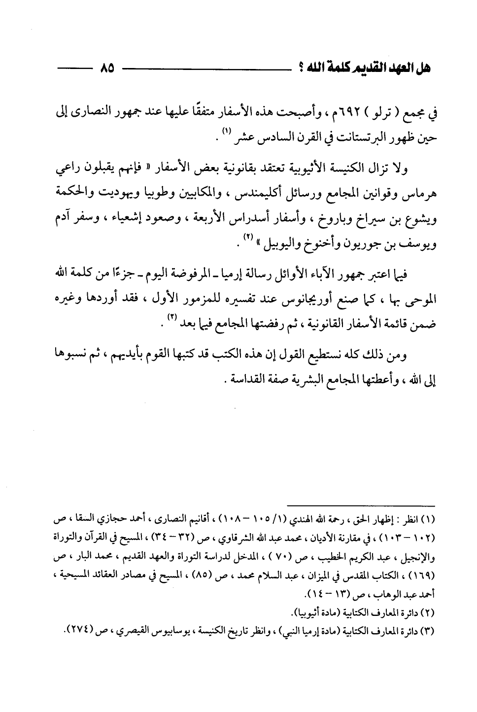 (¬1) انظر: إظهار الحق، رحمة الله الهندي (1/ 105 - 108)، أقانيم النصارى، أحمد حجازي السقا، ص (102 - 103)، في مقارنة الأديان، محمد عبد الله الشرقاوي، ص (32 - 34)، المسيح في القرآن والتوراة والإنجيل، عبد الكريم الخطيب، ص (70)، المدخل لدراسة التوراة والعهد القديم، محمد البار، ص (169)، الكتاب المقدس في الميزان، عبد السلام محمد، ص (85)، المسيح في مصادر العقائد المسيحية، أحمد عبد الوهاب، ص (13 - 14).