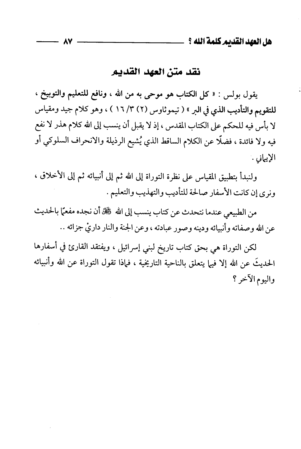 ولنبدأ بتطبيق المقياس على نظرة التوراة إلى الله ثم إلى أنبيائه ثم إلى الأخلاق، ونرى إن كانت الأسفار صالحة للتأديب والتهذيب والتعليم.