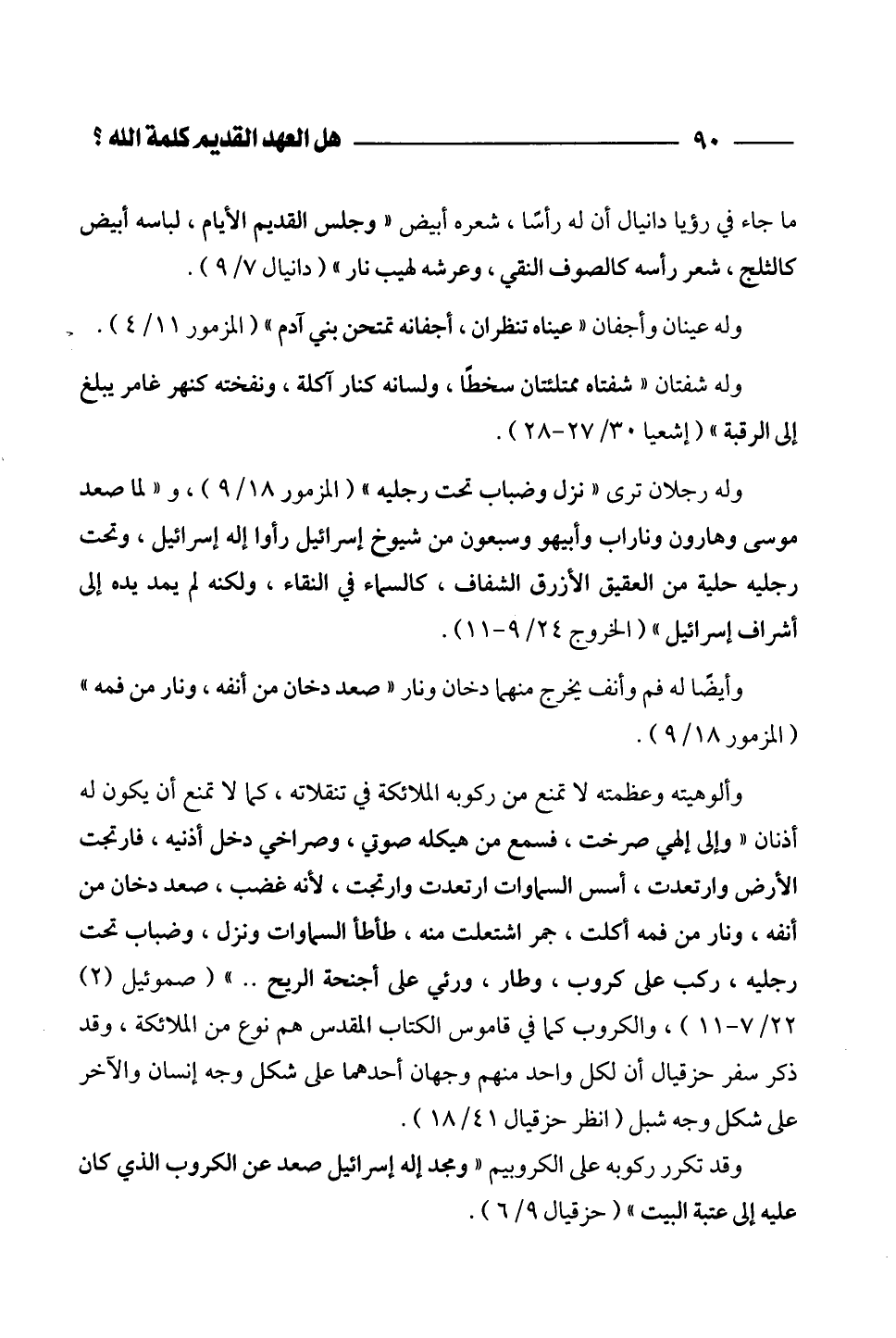 وألوهيته وعظمته لا تمنع من ركوبه الملائكة في تنقلاته، كما لا تمنع أن يكون له أذنان "وإلى إلهي صرخت، فسمع من هيكله صوتي، وصراخي دخل أذنيه، فارتجت الأرض وارتعدت، أسس السماوات ارتعدت وارتجت، لأنه غضب، صعد دخان من أنفه، ونار من فمه أكلت، جمر اشتعلت منه، طأطأ السماوات ونزل، وضباب تحت رجليه، ركب على كروب، وطار، ورئي على أجنحة الريح ... " (صموئيل (2) 22/ 7 - 11)، والكروب كما في قاموس الكتاب المقدس هم نوع من الملائكة، وقد ذكر سفر حزقيال أن لكل واحد منهم وجهان أحدهما على شكل وجه إنسان والآخر على شكل وجه شبل (انظر حزقيال 41/ 18).