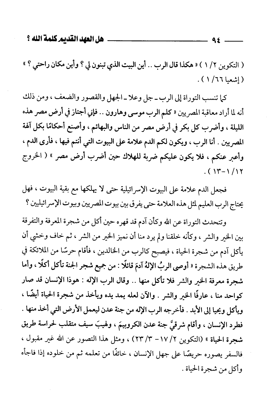 وتتحدث التوراة عن الله وكأن آدم قد قهره حين أكل من شجرة المعرفة والتفرقة بين الخير والشر، وكأنه خلقنا ولم يرد منا أن نميز الخير من الشر، ثم خاف وخشي أن يأكل آدم من شجرة الحياة، فيصبح كالرب من الخالدين، فأقام حرساً من الملائكة في طريق هذه الشجرة " أوصى الربُ الإلهُ آدمَ قائلاً: من جميع شجر الجنة تأكل أكلاً، وأما شجرة معرفة الخير والشر فلا تأكل منها .... وقال الرب الإله: هوذا الإنسان قد صار كواحد منا، عارفاً الخير والشر. والآن لعله يمد يده ويأخذ من شجرة الحياة أيضاً، ويأكل ويحيا إلى الأبد. فأخرجه الرب الإله من جنة عدن ليعمل الأرض التي أخذ منها. فطرد الإنسان، وأقام شرقيَّ جنة عدن الكروبيمَ، ولهيبَ سيف متقلب لحراسة طريق شجرة الحياة" (التكوين 2/ 17 - 3/ 23)، ومثل هذا التصور عن الله غير مقبول، فالسفر يصوره حريصاً على جهل الإنسان، خائفاً من تعلمه ثم من خلوده إذا فاجأه وأكل من شجرة الحياة.
